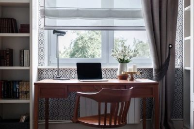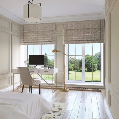 - Il arrive qu'il y ait une table à côté de la fenêtre. Ensuite, les stores romains seront très utiles. Contrairement aux rideaux / tulle conventionnels, ils ne restreignent pas les mouvements et n'interfèrent pas avec le flux de travail. Cette option est également appropriée si la chambre a de grandes fenêtres.