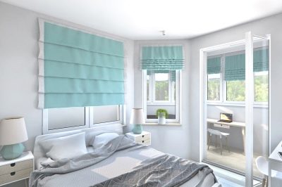 - S'il y a un balcon dans la chambre, les gens décorent non seulement la fenêtre, mais aussi la porte du balcon avec des rideaux romains. Dans ce cas, il est préférable de choisir des rideaux romains au sol. Et peu importe que la porte du balcon soit entièrement ou partiellement vitrée.