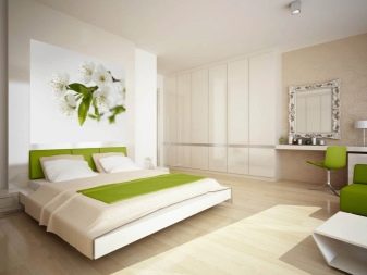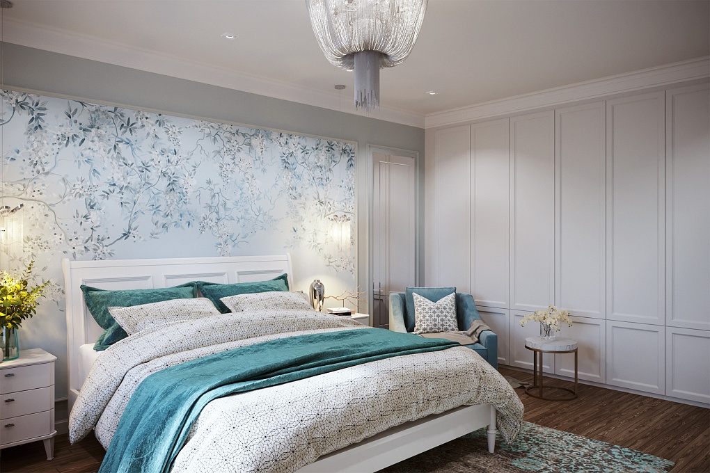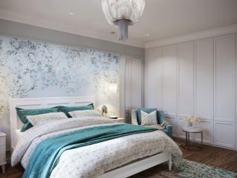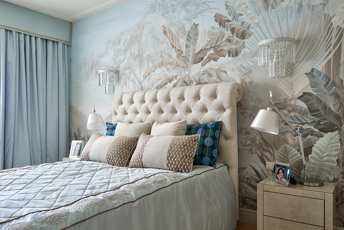 - Très belle option moderne. La palette de couleurs des détails intérieurs - rideaux, lit, linge de lit, tables de chevet - est en parfaite harmonie avec la fresque, montrant de grandes feuilles stylisées de plantes tropicales.
