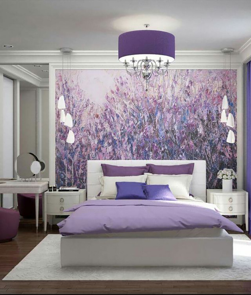 - L'option suivante : une chambre moderne, réalisée dans des tons blanc-lilas-violet. La fresque derrière la tête de lit ressemble à une combinaison abstraite de coups de pinceau, mais un examen plus attentif révèle un champ de lavande.