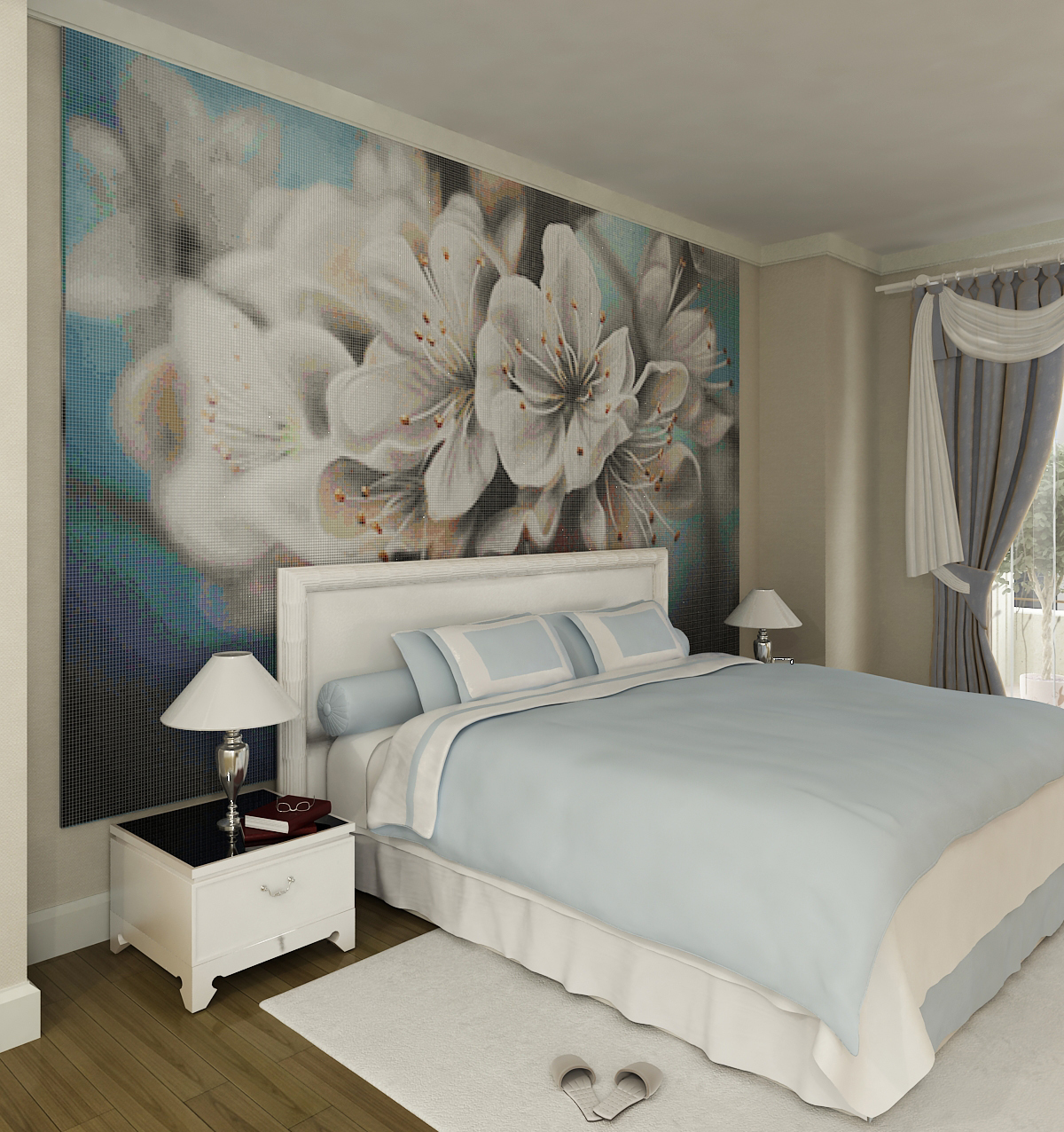 Si nous parlons du placement de la fresque dans la chambre, alors le plus souvent elle est placée sur le mur à la tête du lit. Les motifs sont choisis naturels ou antiques, parfois abstraits, mais toujours calmes, dans des couleurs pastel.