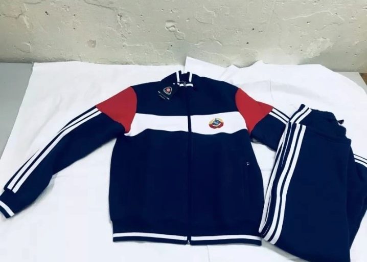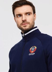 Les costumes sont présentés sous forme d'ensembles : une veste et un pantalon olympiques. Les couleurs sont aussi classiques : bleu, noir, rouge. Il peut y avoir des inserts blancs, des rayures, des symboles soviétiques. Séparément, il convient de noter que tous les logos sont brodés, ce qui donne à l'image un aspect tridimensionnel, et il est également un moyen fiable de garder toutes les inscriptions intactes après des lavages répétés.