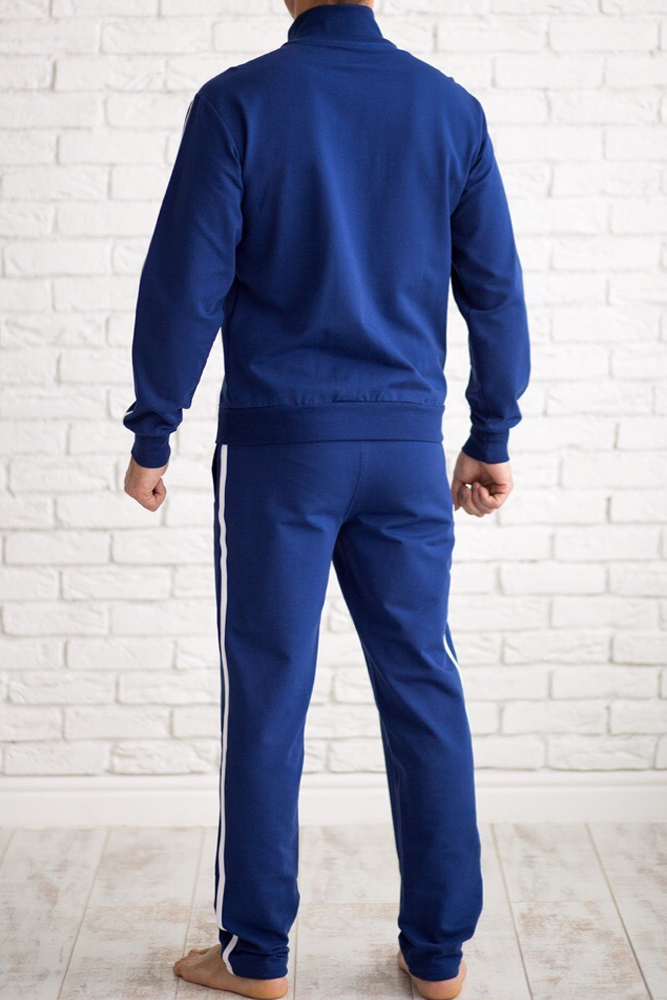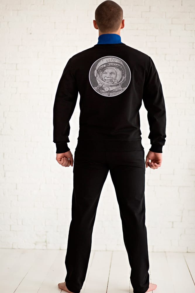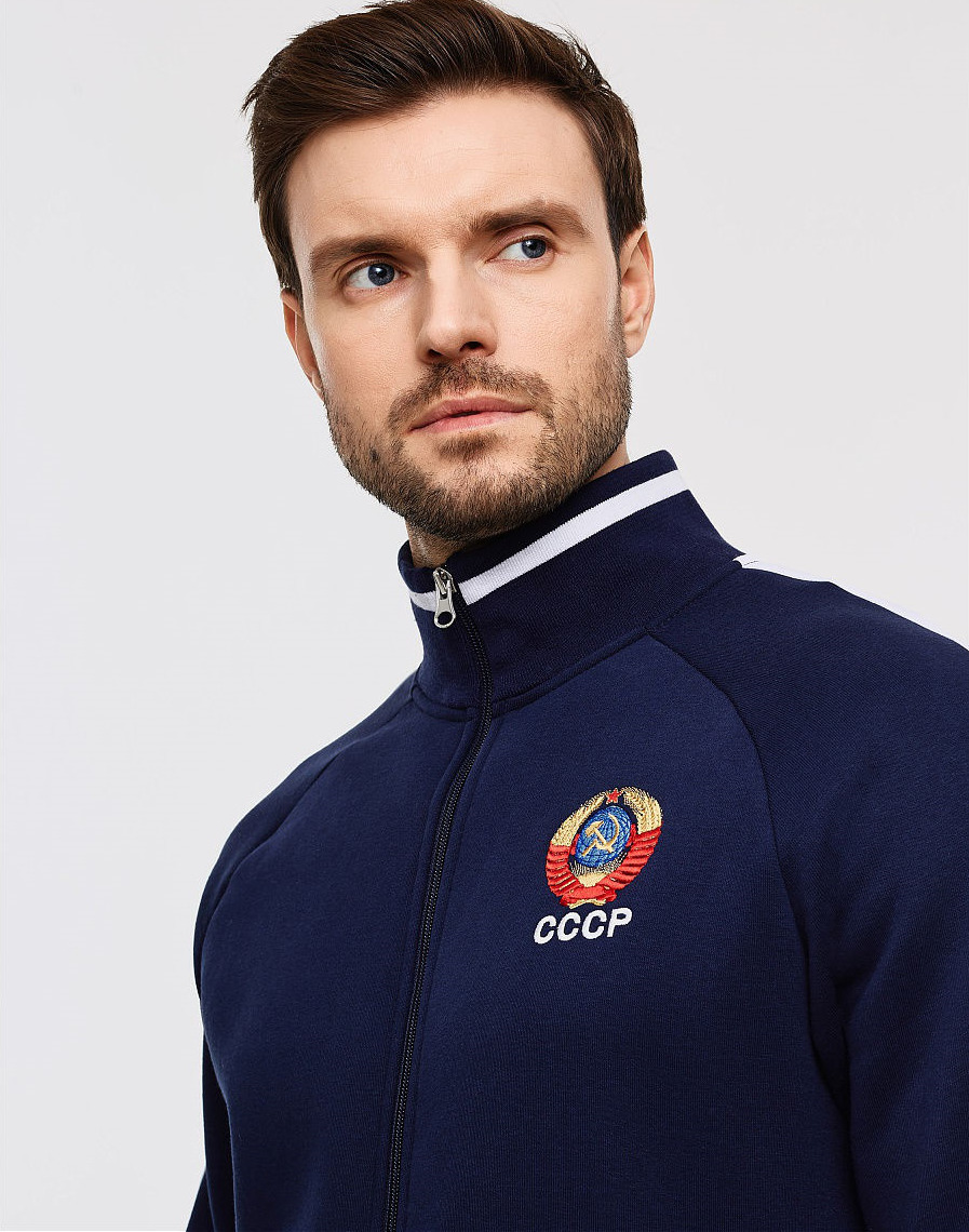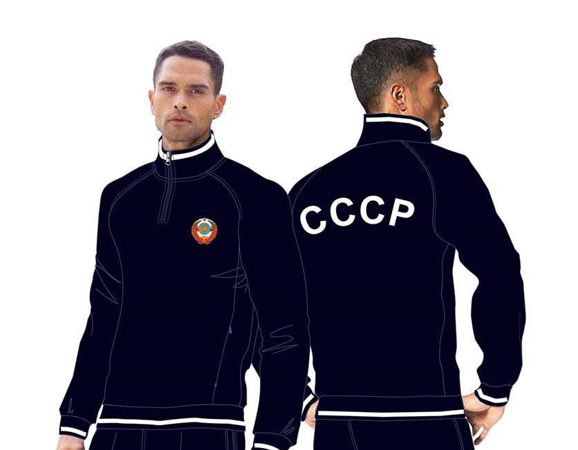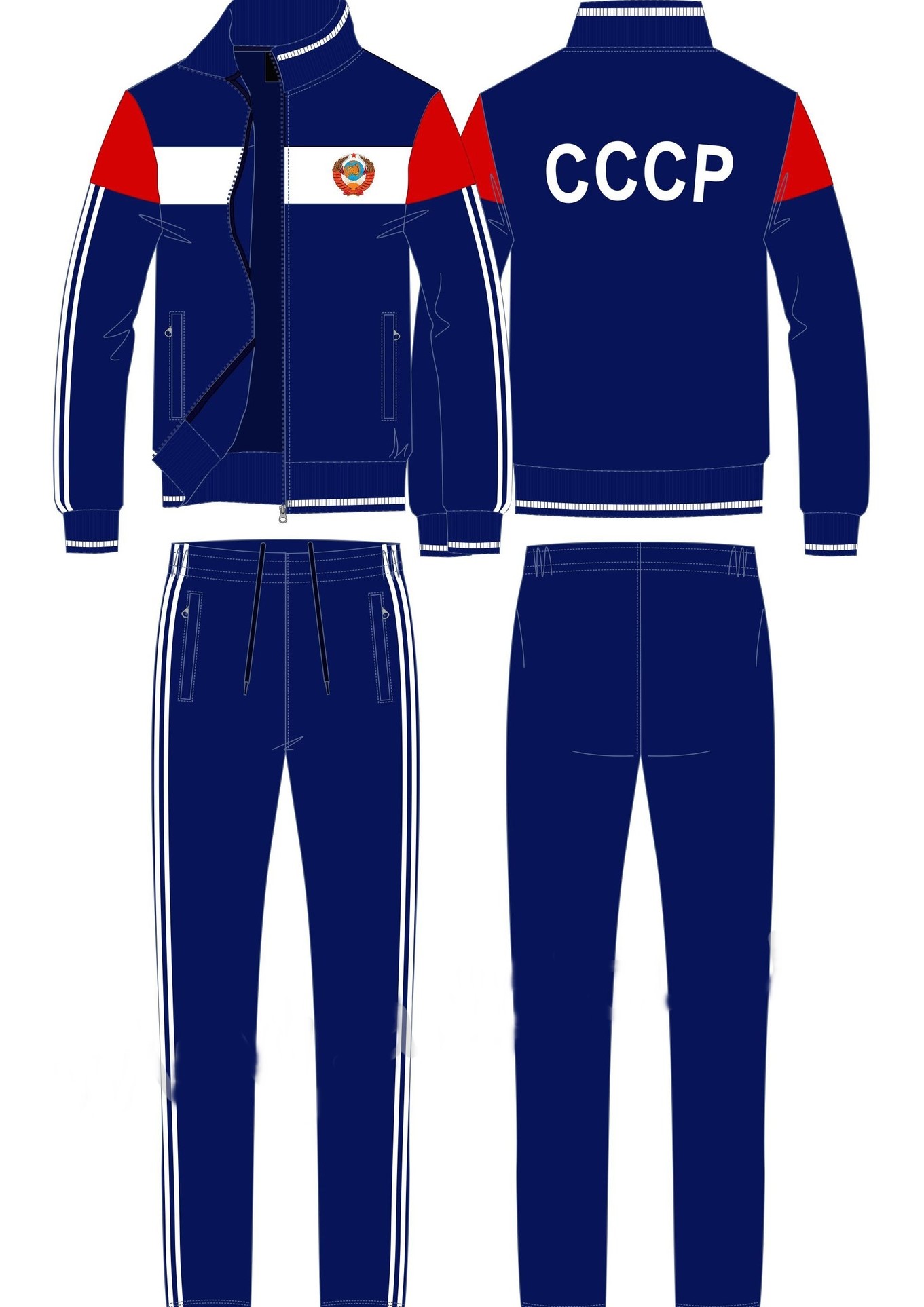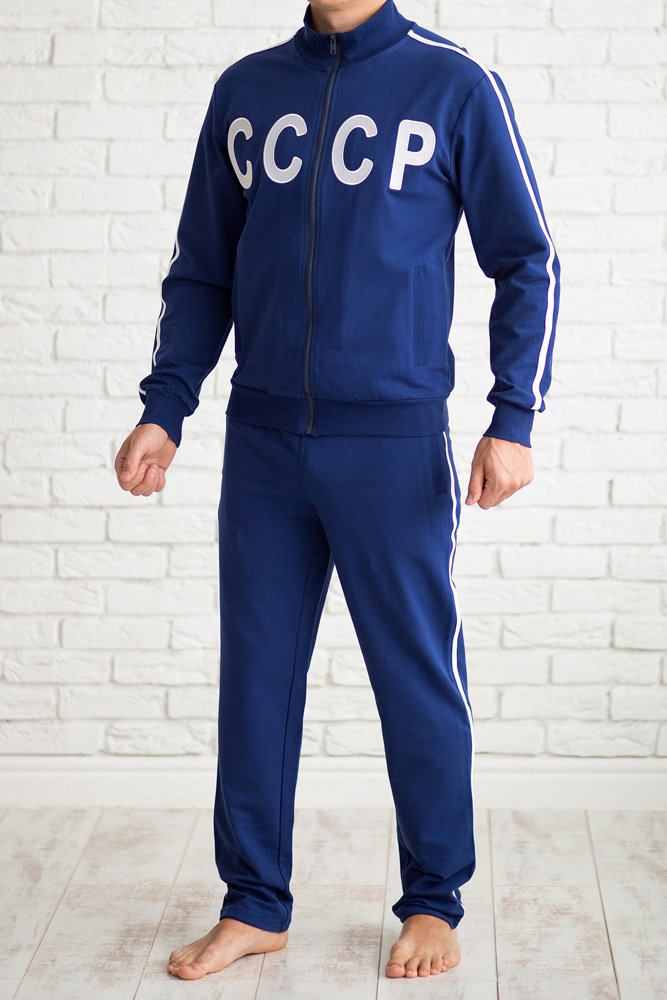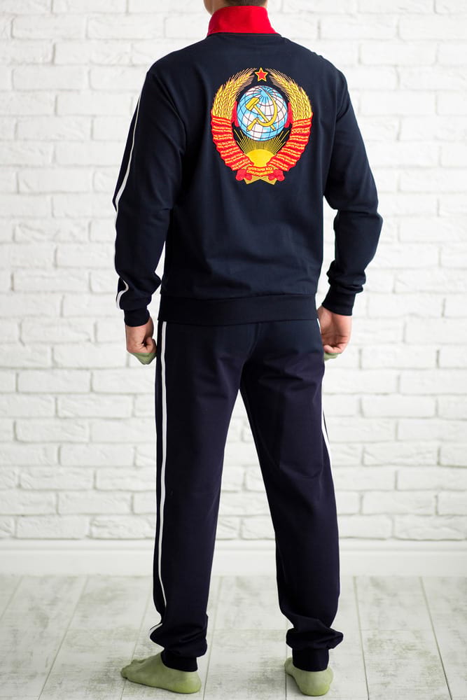 un costume bleu foncé de l'URSS à partir d'un pied de page avec une polaire, un col montant, une manche montée, une fermeture éclair sur la veste au milieu de la poitrine, une broderie de l'emblème de l'URSS sur la poitrine, une inscription sur le dos en grosses lettres blanches « URSS » ;