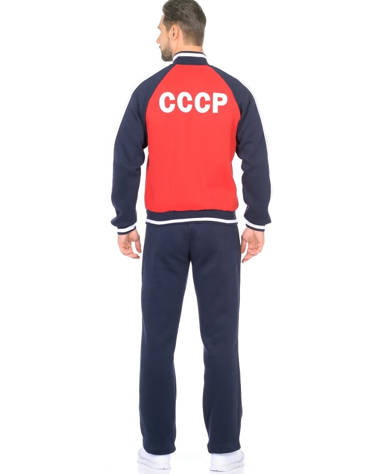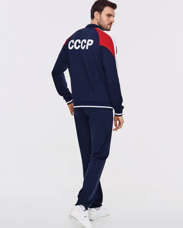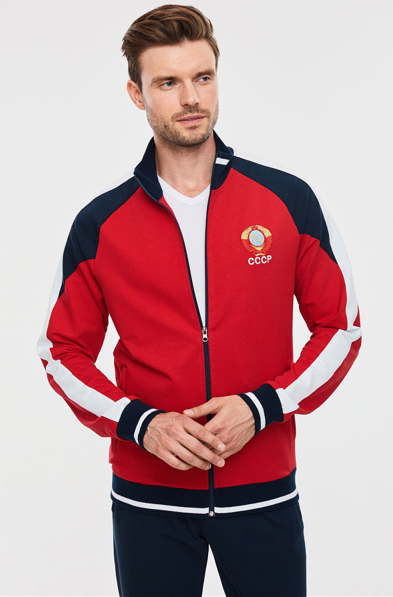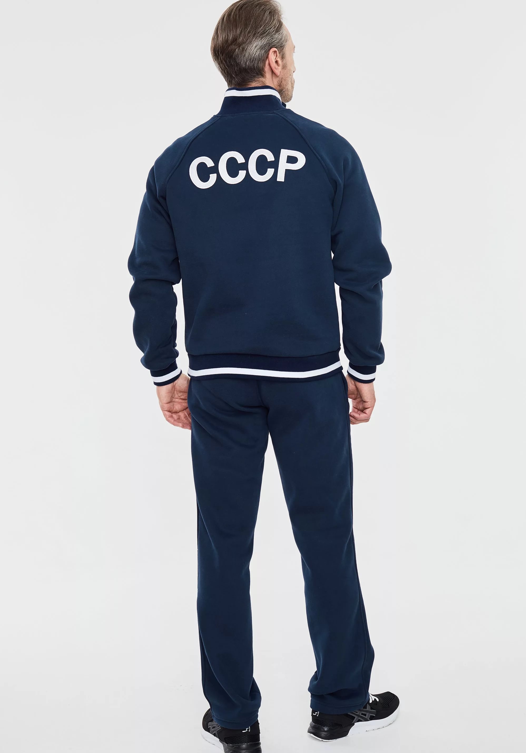 survêtement pour hommes en coton avec élasthanne, une veste rouge avec une fermeture éclair, avec l'emblème et l'inscription "URSS", qui sont brodés en soie, un pantalon droit classique en bleu profond.