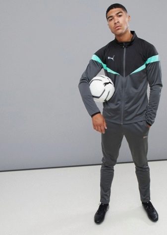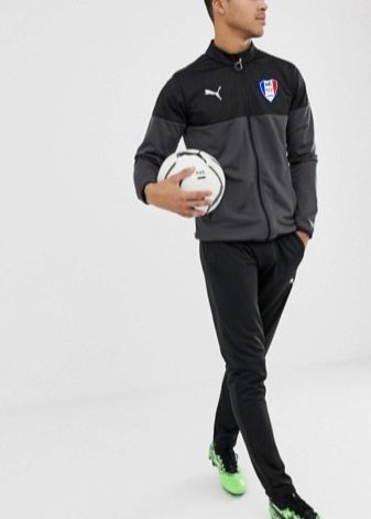 A la manière des footballeurs. Un costume de sport pour homme réalisé dans le style d'une célèbre équipe de football ravira ses propriétaires avec un look facilement reconnaissable. L'assortiment de la marque comprend des ensembles avec les logos d'Arsenal, de Biélorussie, d'Italie. Le costume se compose d'un ensemble T-shirt et short, ainsi que d'un sweat-shirt avec un pantalon.