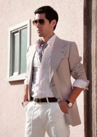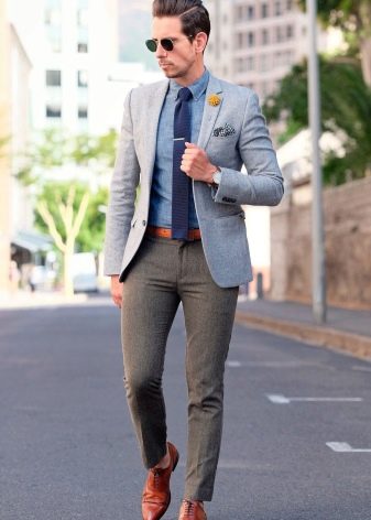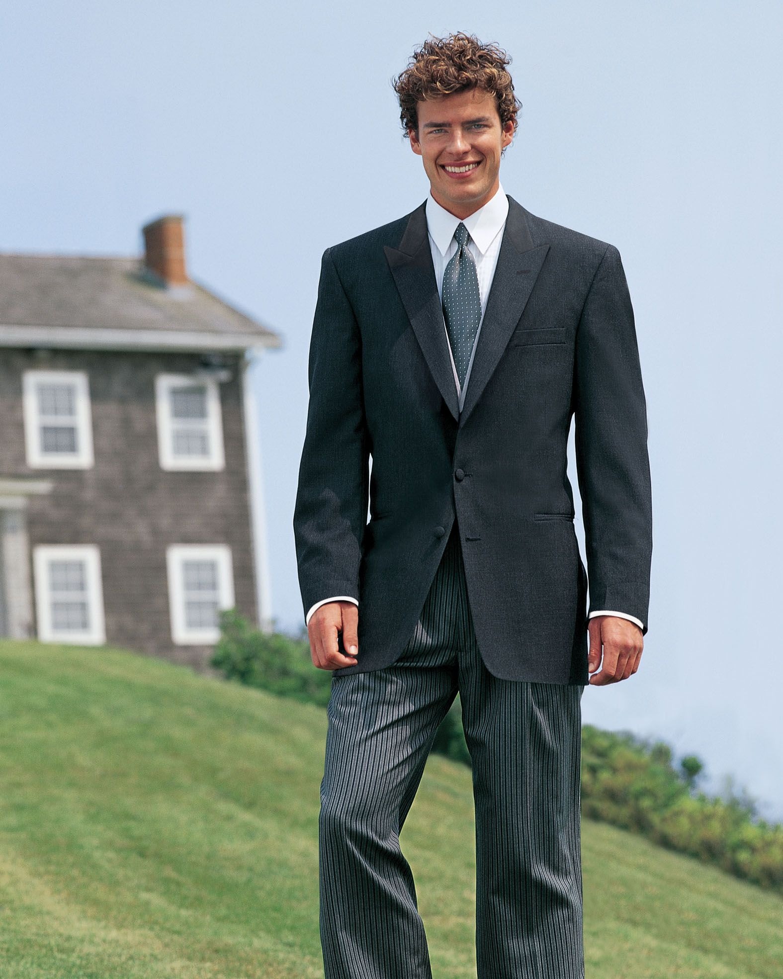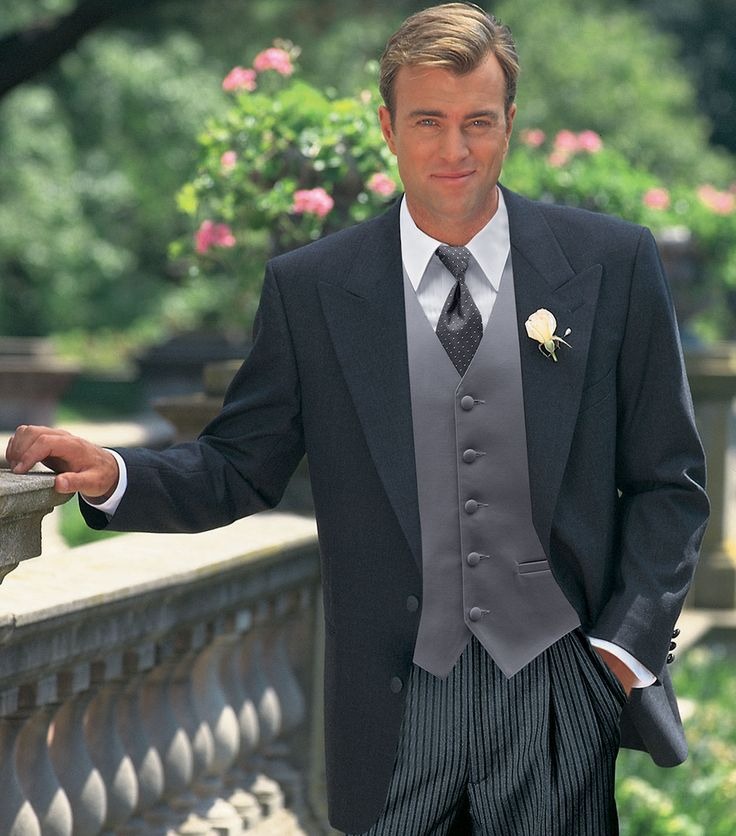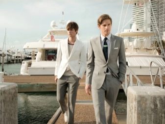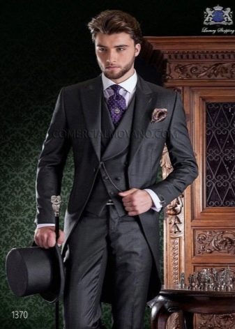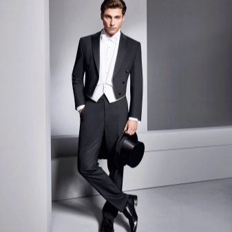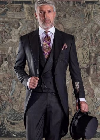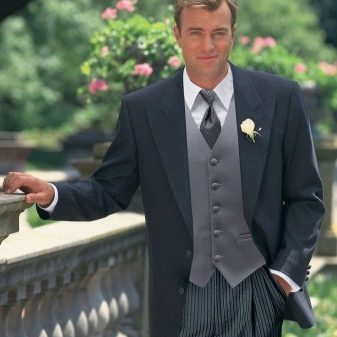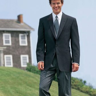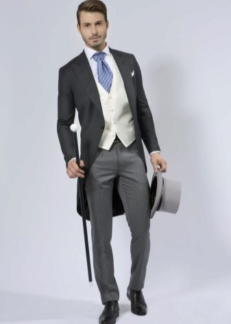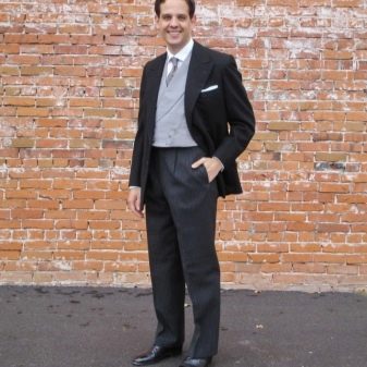 Le style semi-formel est également divisé en groupes en fonction de l'heure de la journée. Une option séparée est prévue pour la journée et le soir. Dans la journée, vous devez sélectionner l'option Poussette. Ceci est une version simplifiée de Morning Dress. Dans ce cas, vous pouvez porter un smoking non seulement en noir, mais aussi en gris. L'image est complétée par un pantalon blanc à rayures grises.