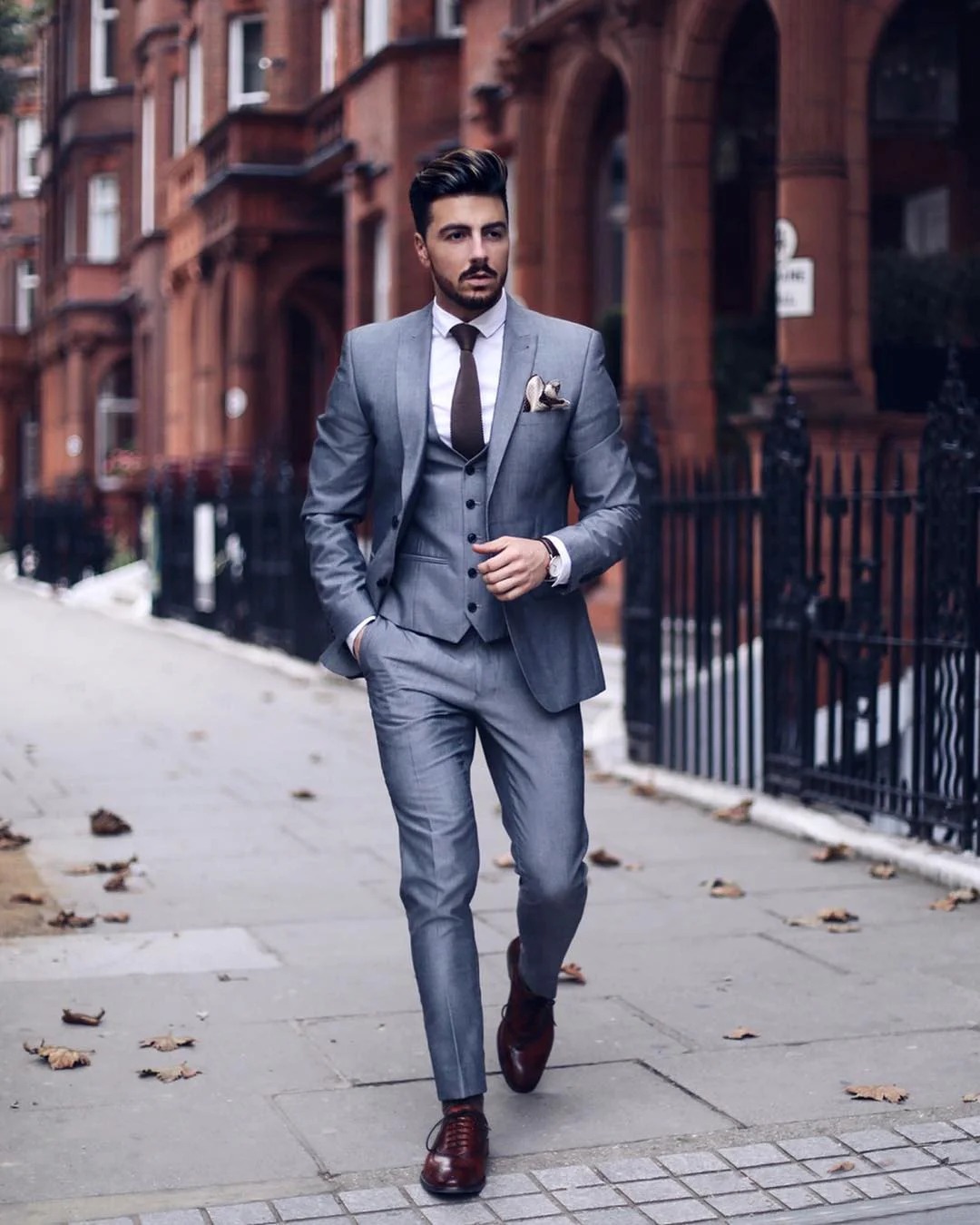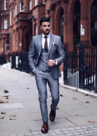 La cravate peut être grise ou argentée. La deuxième option est plus élégante et élégante. Assurez-vous de porter un gilet. Il peut être gris clair ou bleu clair.
