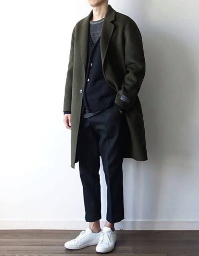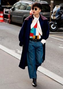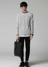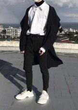 - Une référence au style d'affaires : un manteau porté sur un cardigan et un pull fin. Le pantalon est raccourci, rétréci vers le bas. Malgré le fait que toute la tenue soit de couleurs sombres, les baskets blanches s'intègrent parfaitement dans ce look.