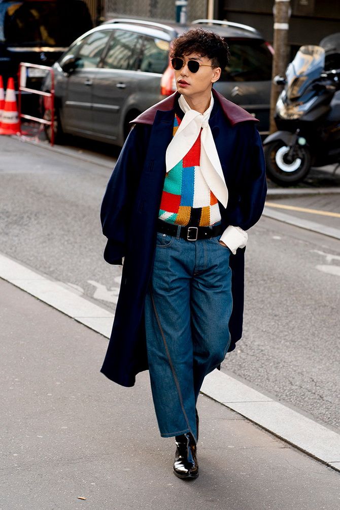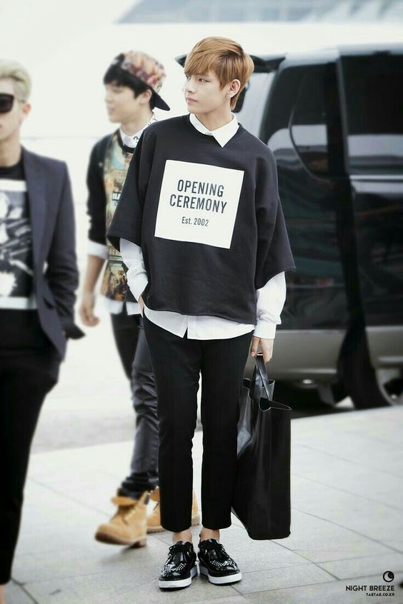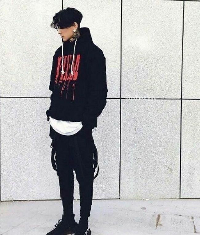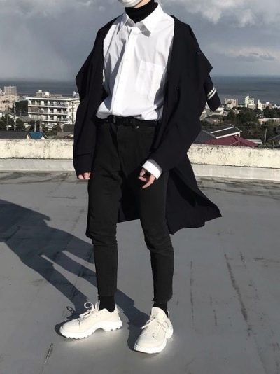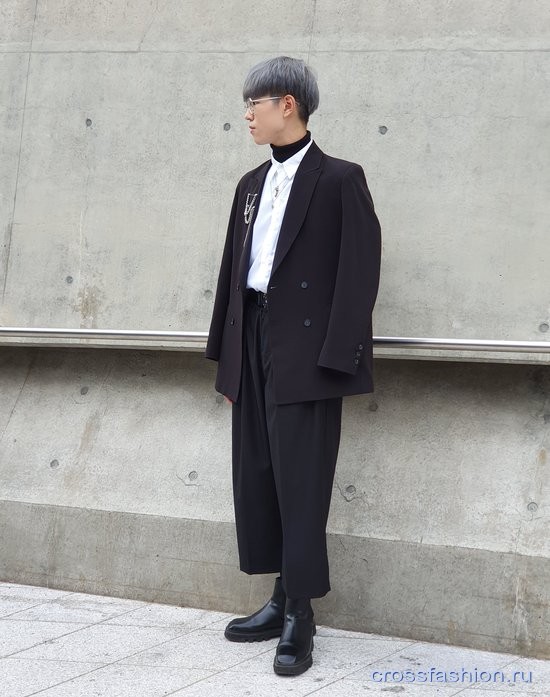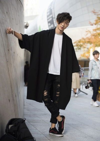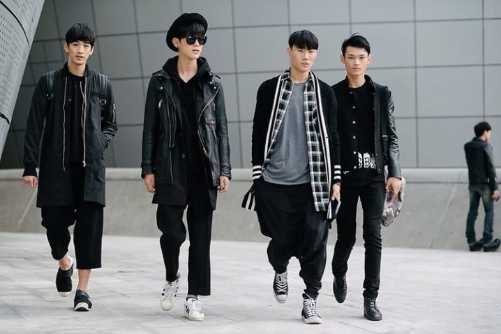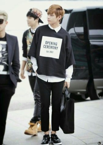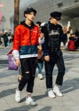 - Éclectisme... Les Coréens combinent très habilement des choses liées à différents styles: des costumes classiques sont mélangés avec des baskets, un long manteau avec un jean déchiré, un t-shirt avec un imprimé de bande dessinée est enfilé sous une veste stricte.