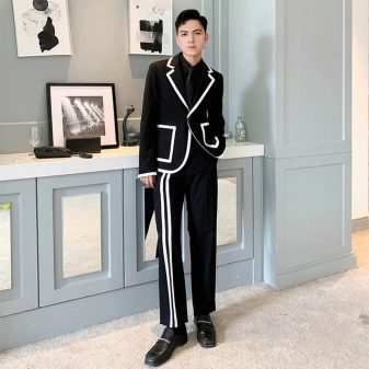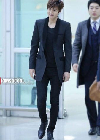 - Costume d'affaires... Un autre élément de style préféré. Dans le même temps, la veste doit être ajustée, le pantalon doit être rétréci, sa longueur doit atteindre l'os de la jambe. L'image est souvent complétée par une cravate étroite, si une chemise est portée sous la veste. Vous pouvez le remplacer par un T-shirt ou un col roulé à col montant.