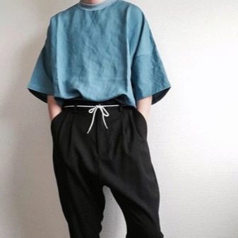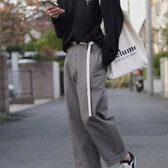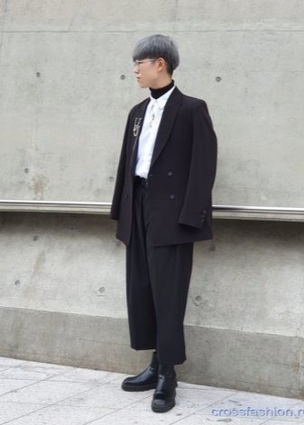 À ces fins, les gars portent des pantalons taille haute, les ceinturant avec des ceintures brillantes ou larges avec des boucles massives, et utilisent également le contraste des matériaux des parties supérieure et inférieure de la garde-robe.