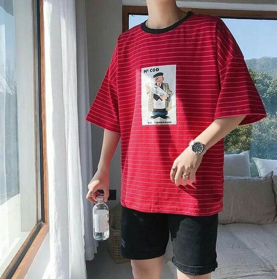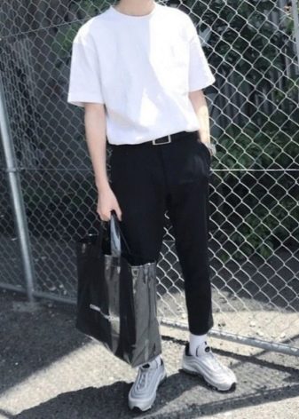 - T-shirt... C'est ce dont le dandy de la ville ne peut certainement pas se passer. En règle générale, ils diffèrent par une coupe ample, un col en V. Les t-shirts peuvent être soit unis, soit avec un imprimé, souvent très atypique pour les hommes : avec des chats, des chiens, des personnages d'anime. La couleur de la chose peut également varier - du noir et blanc au rose, vert clair, bleu.