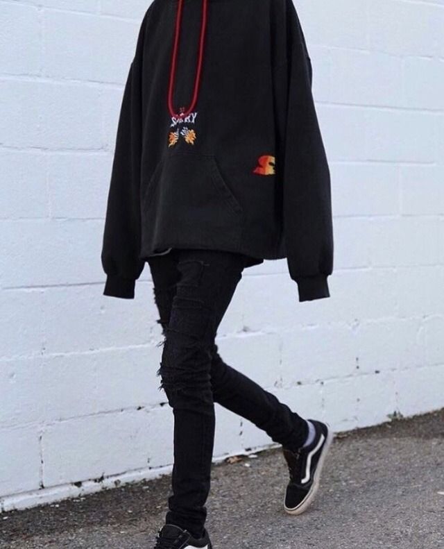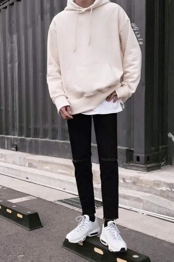 - Aspect typique de la rue : un sweat à capuche imprimé porté sur un t-shirt blanc allongé. L'image est complétée par un pantalon skinny et des baskets.