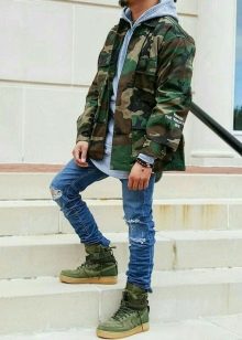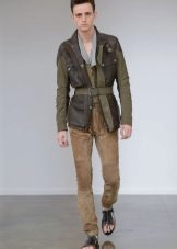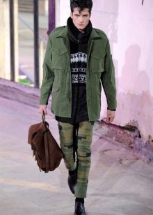 Si vous souhaitez à nouveau souligner l'orientation militaire de l'image, vous pouvez également recourir à l'utilisation d'autres éléments du style en question. Les hommes à la mode sont parfaits pour cela. bottes grand bâtiment, les pantalons nuance kaki, ceinture en cuir avec une grosse boucle. Des accessoires stylisés pour hommes seront également utiles.