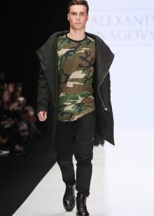 - Un ensemble jeune et élégant peut être composé d'un col roulé ou d'un t-shirt foncé, d'une veste verte ou d'une doudoune avec un col en fourrure noire, d'un pantalon camouflage vert foncé et de bottes noires (les bottines à lacets sont les mieux adaptées, le pantalon doit être rentré en eux).
