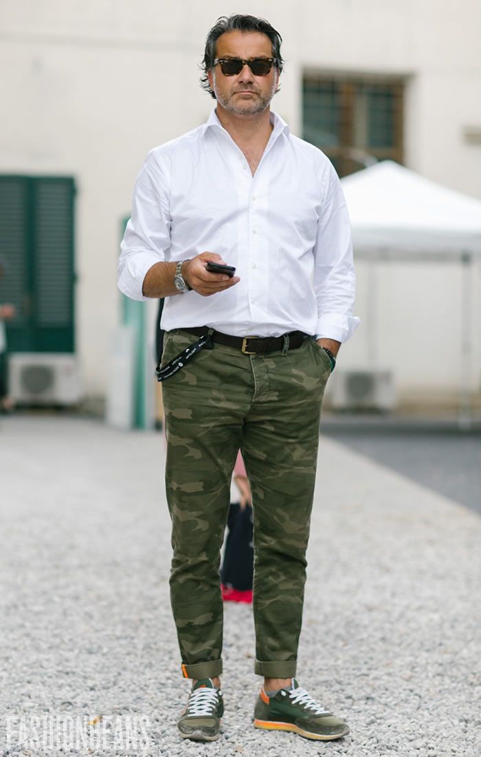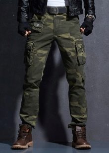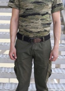Pantalon militaire aura l'air plus expressif si vous les complétez avec un bracelet en cuir avec une grande plaque. Vous pouvez opter pour une combinaison avec des bottines hautes à lacets et rentrer votre pantalon dedans. Si vous souhaitez adoucir l'effet, vous devez rechercher les bonnes baskets ou baskets.