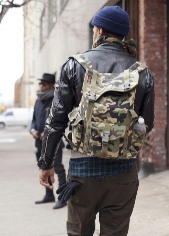 Le sac de style militaire le plus réussi est un sac à dos pour homme kaki ou camouflage. Une bonne décoration pour l'image d'un homme sera sac en cuir de haute qualité avec une longue bandoulière.