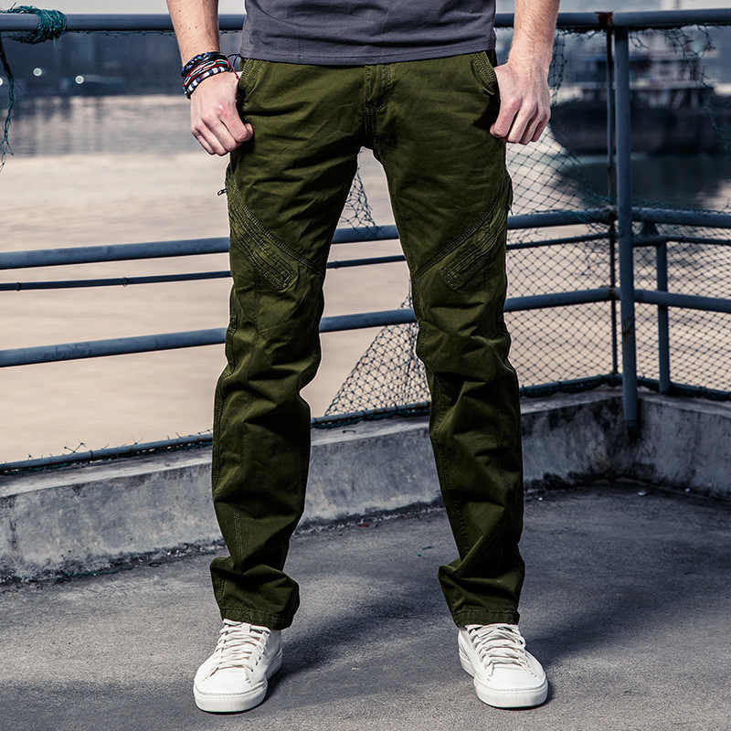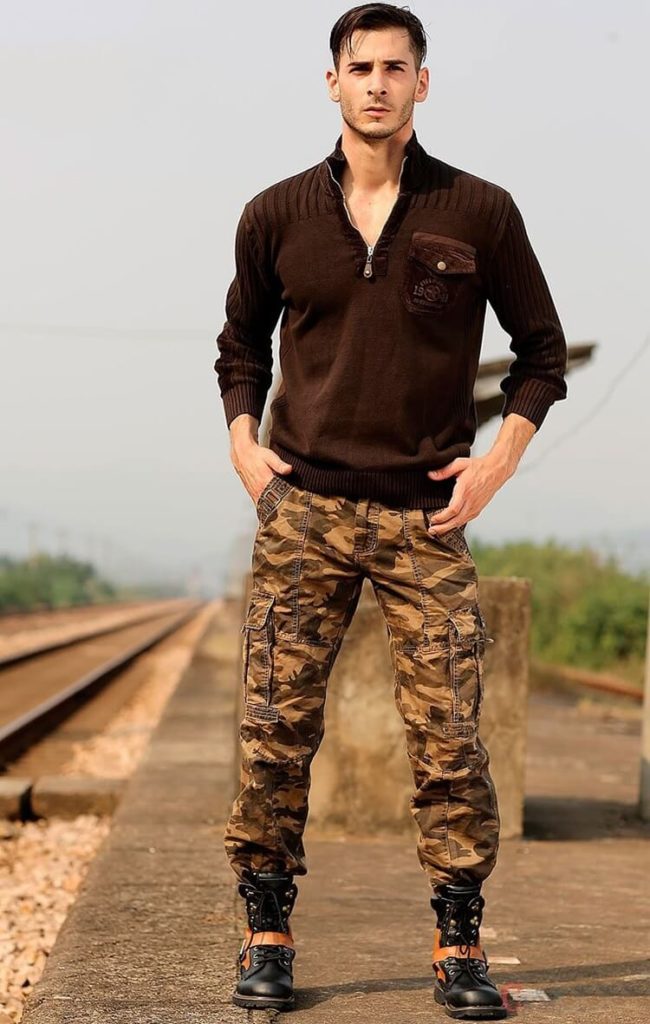 - Une image masculine peut être formée à partir des éléments suivants: une veste noire avec des poches extérieures, un pantalon militaire crème ou beige avec des ajouts similaires, de grandes baskets à lacets marron foncé.