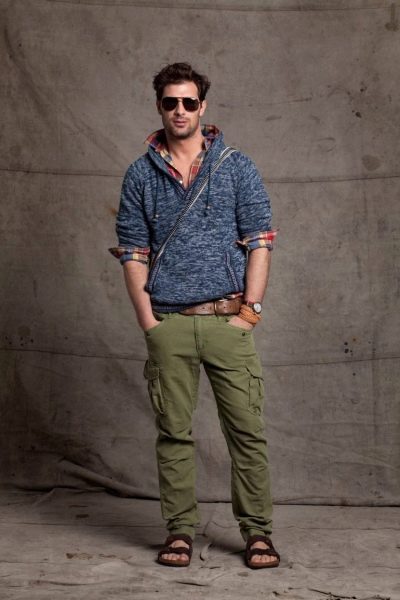 - Le rebelle original sera un ensemble élégant, composé d'un pull ou d'un sweat-shirt bleu foncé, d'un pantalon vert ou pistache avec des poches plaquées et de sandales en cuir marron foncé. Des lunettes de soleil aviateur foncées, un bracelet en cuir tissé et une montre avec un bracelet foncé complèteront un look aussi intéressant.