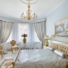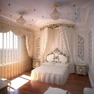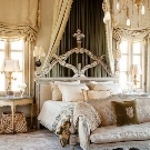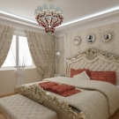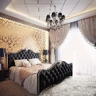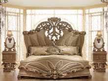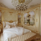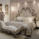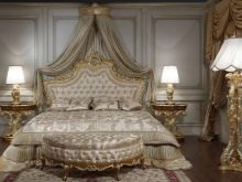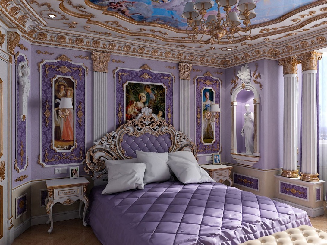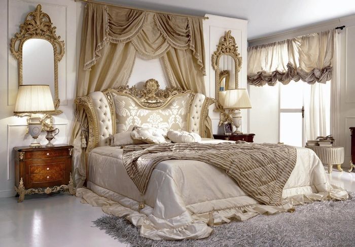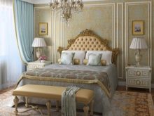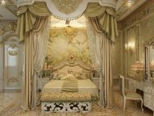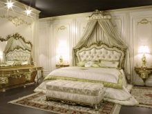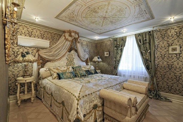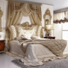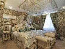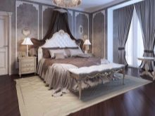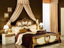 Le style baroque est inconcevable sans colonnes et statues. Cette magnificence demande de l'espace. Par conséquent, le baroque est utilisé pour les pièces d'une superficie d'au moins 30 à 40 mètres carrés. Le baroque est à l'opposé du mouvement populaire art nouveau moderne. L'accent principal dans la chambre est le lit; toute la composition de l'intérieur est construite autour de lui. Le lit est situé au centre de la pièce, il se distingue par un forgeage complexe, une haute tête de lit sculptée et un somptueux baldaquin.