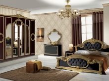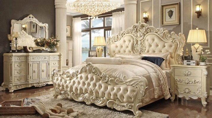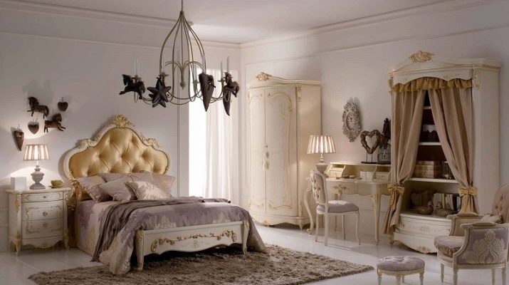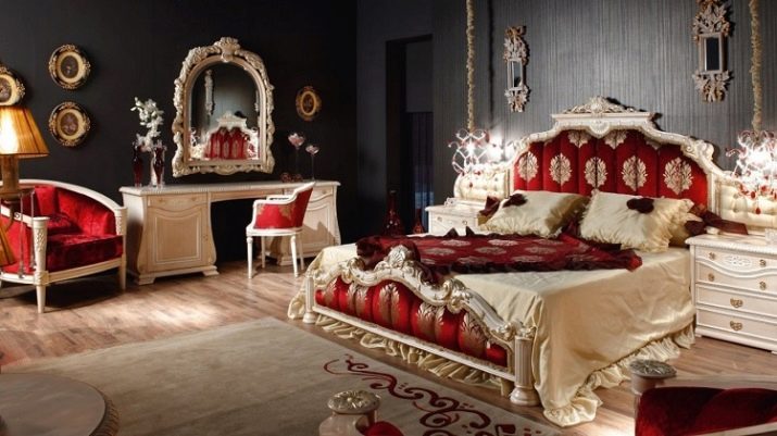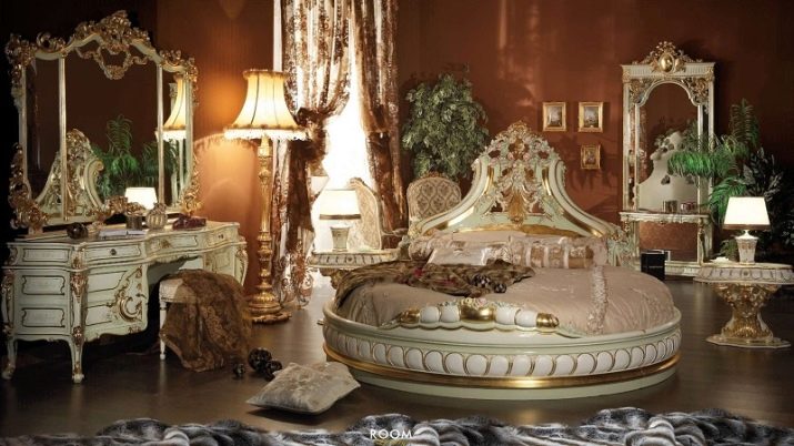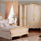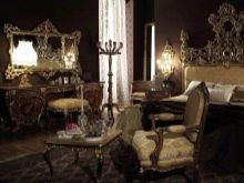 Des banquettes aux jambes bouclées sont placées près du lit. Il est conseillé d'utiliser des modèles recouverts de tissu. Le style baroque exige que tous les meubles soient exclusifs. La solution idéale serait un mobilier sur mesure. En plus du lit, une coiffeuse et des tables de chevet devraient être présentes dans la chambre baroque. Ils formeront un ensemble unique avec le lit dans son ensemble.