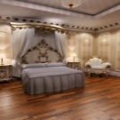 Pour décorer les sols d'une chambre baroque, le marbre est idéal. Cependant, le parquet, le stratifié ou les carreaux conviennent - le plus important est que le matériau s'intègre harmonieusement à l'intérieur et ait l'air cher. Et bien sûr, une chambre de style palace est impensable sans un tapis à poils longs. Il ajoutera non seulement de la sophistication à l'intérieur, mais offrira également un confort et un chauffage supplémentaires.