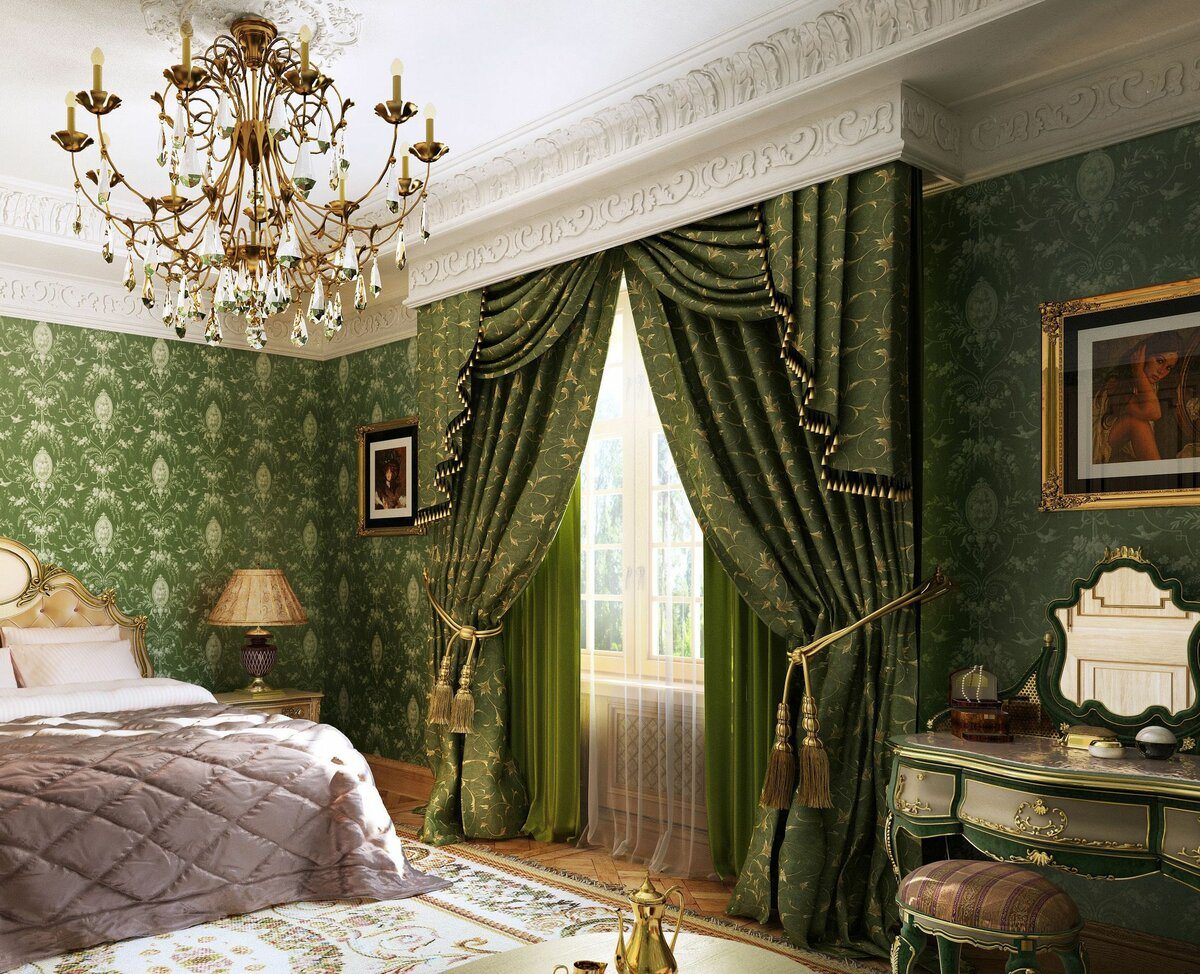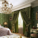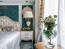 Un miroir mural plein dans un cadre doré permet d'augmenter visuellement la taille de la chambre. Mais les plantes dans la chambre sont indésirables, le seul aveu est un petit bouquet de fleurs fraîchement coupées sur la coiffeuse. Les ouvertures des fenêtres de la salle baroque sont décorées de longs et lourds rideaux qui tombent du plafond au sol. Le plus souvent, des nuances sombres sont utilisées - émeraude, bordeaux, vin ou bleu royal.