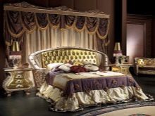 Lors de la décoration d'une pièce dans le style baroque, une attention particulière est accordée au choix du mobilier. Le lit occupe ici une place centrale - il doit être volumineux et spacieux, même si une personne s'y repose seule. La chose la plus harmonieuse dans un tel intérieur ressemble à un endroit pour dormir avec une tête de lit haute, décorée de sculptures, de dorures ou d'une combinaison de plusieurs races précieuses.