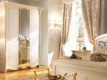 Le baroque n'accepte pas la fragmentation lors de la décoration d'une chambre, tous les éléments doivent être faits des mêmes matériaux, dans des textures et des nuances identiques. Le système de rangement est assuré par une armoire à double pliage - elle peut accueillir un grand nombre de choses et joue en même temps le rôle d'élément décoratif. Un pouf miniature, ainsi que des fauteuils et des chaises - ils doivent avoir des couleurs monochromes et une forme arrondie - apporteront un charme particulier à l'intérieur de la chambre. Il est conseillé de mettre un petit canapé à côté du lit - ensemble, ils formeront une seule composition stylistique.