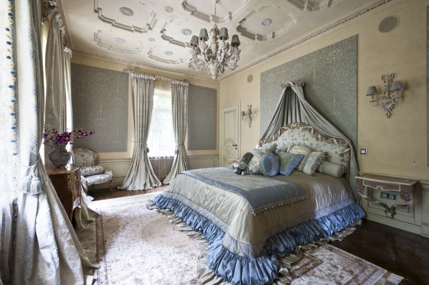 La palette de teintes joue un rôle important dans la création de l'intérieur du palais de la chambre. Les tons clairs et foncés sont autorisés ici. Une exigence indispensable est le maintien d'un concept unique dans la gamme de teintes globale.Les plus répandues sont les couleurs rouge, dorée, marron foncé, bleu pâle, rose et beige. Une option gagnante lors de l'aménagement d'une chambre baroque est le blanc. Il agrandit visuellement l'espace et, en outre, il s'harmonise harmonieusement avec n'importe quelle nuance de mobilier et de décoration. De plus, il semble riche en tandem avec des imprimés plaqués or.