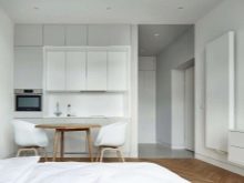 - L'option la plus préférée pour les studios est le minimalisme. Des formes simples, un ensemble fonctionnel et une petite quantité de fleurs dans la décoration sont ce dont vous avez besoin pour aménager de petits espaces.