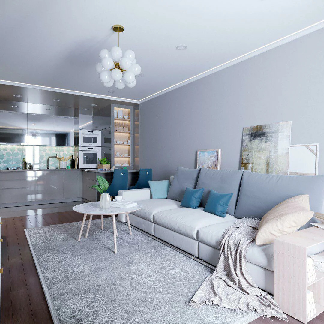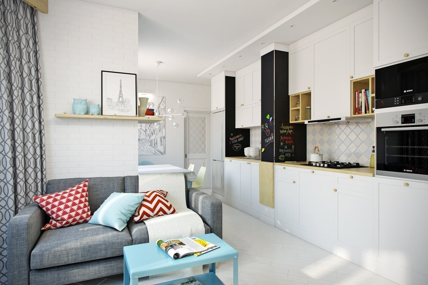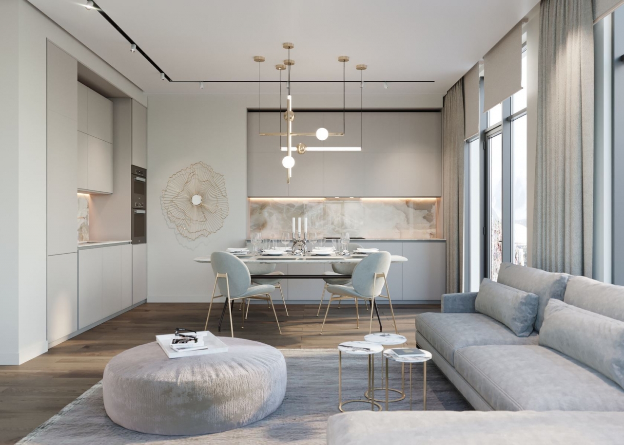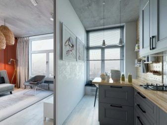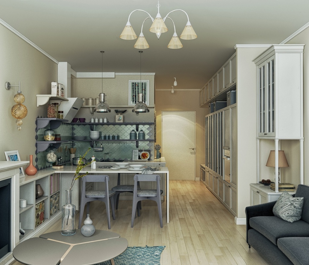 - La cuisine et le salon doivent être conçus dans le même style. Il en va de même pour la conception de la salle de bain et du balcon, si le second est prévu pour être utilisé comme un espace fonctionnel.