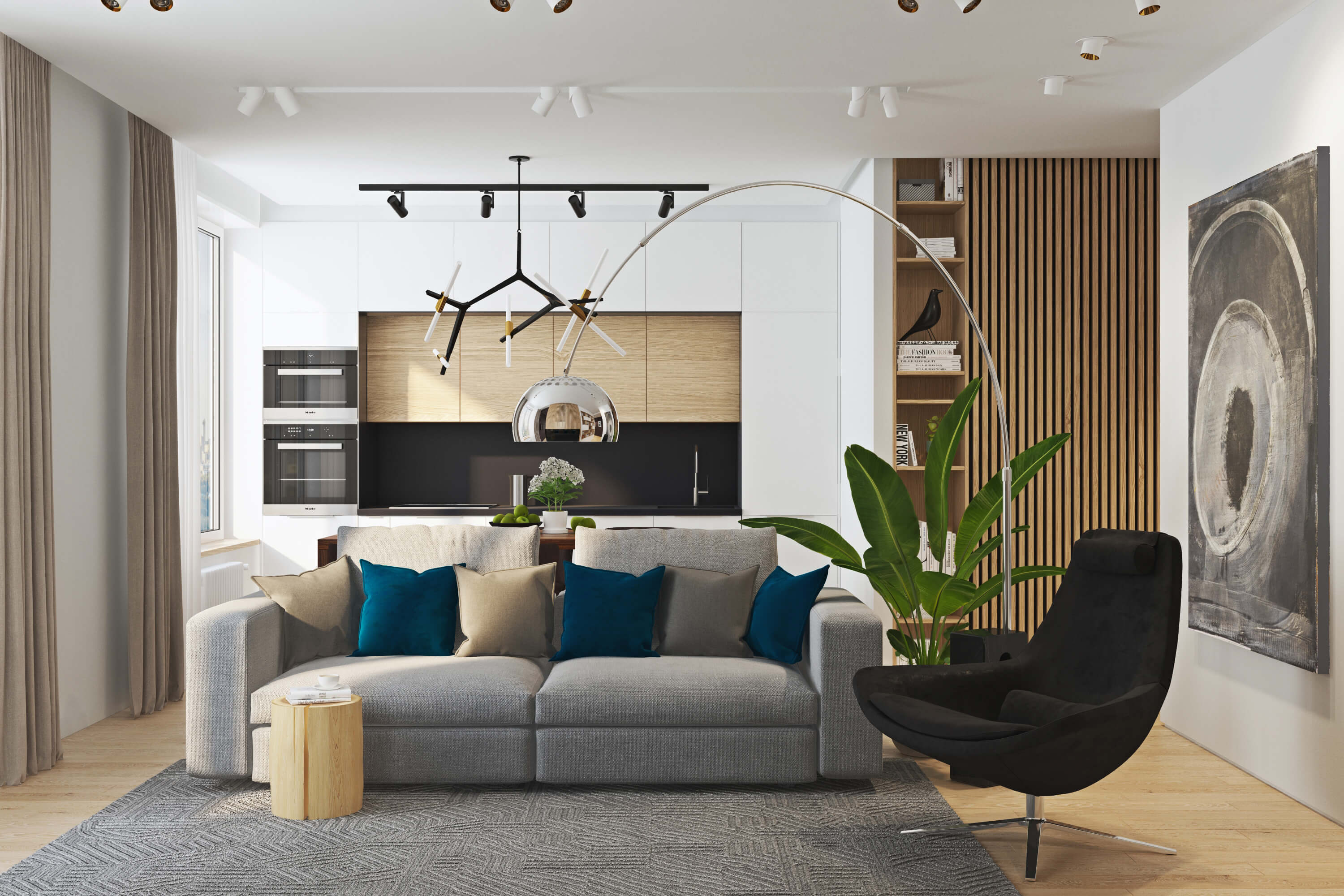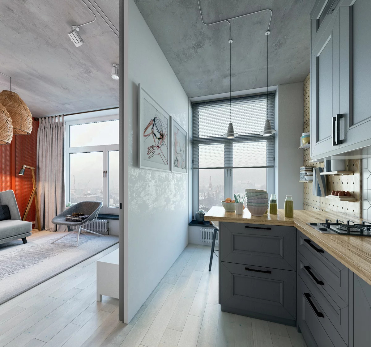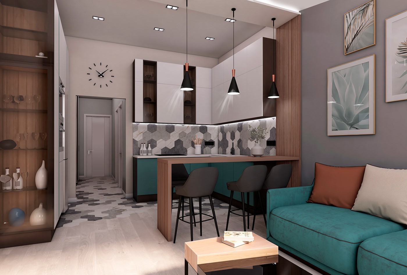 - La cuisine et le salon doivent être conçus dans le même style. Il en va de même pour la conception de la salle de bain et du balcon, si le second est prévu pour être utilisé comme un espace fonctionnel.