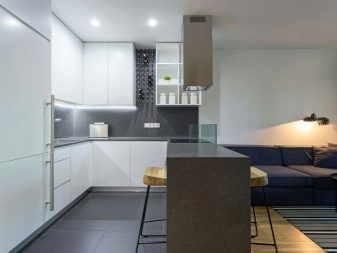 - Il devrait y avoir un minimum d'articles ménagers dans la cuisine. C'est mieux si tout l'équipement est intégré. Aussi, par exemple, une grande table peut être remplacée par un comptoir de bar.