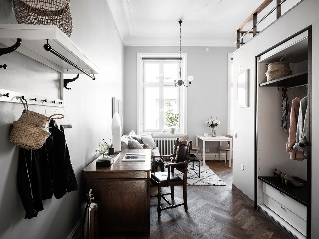- Si l'appartement n'a pas de place pour un placard encombrant, vous pouvez équiper un système de rangement plus compact sous la forme d'étagères séparées ou d'un dressing dans une niche.