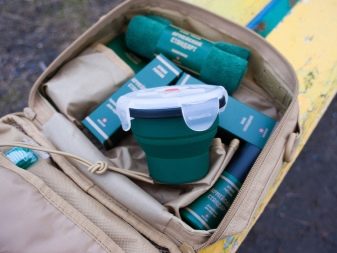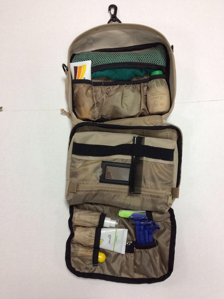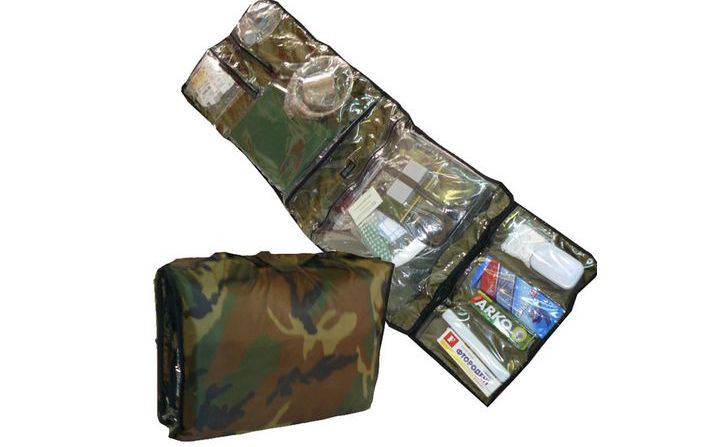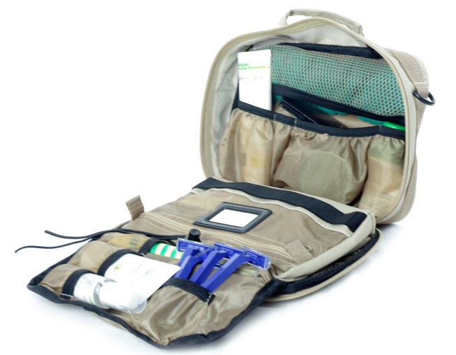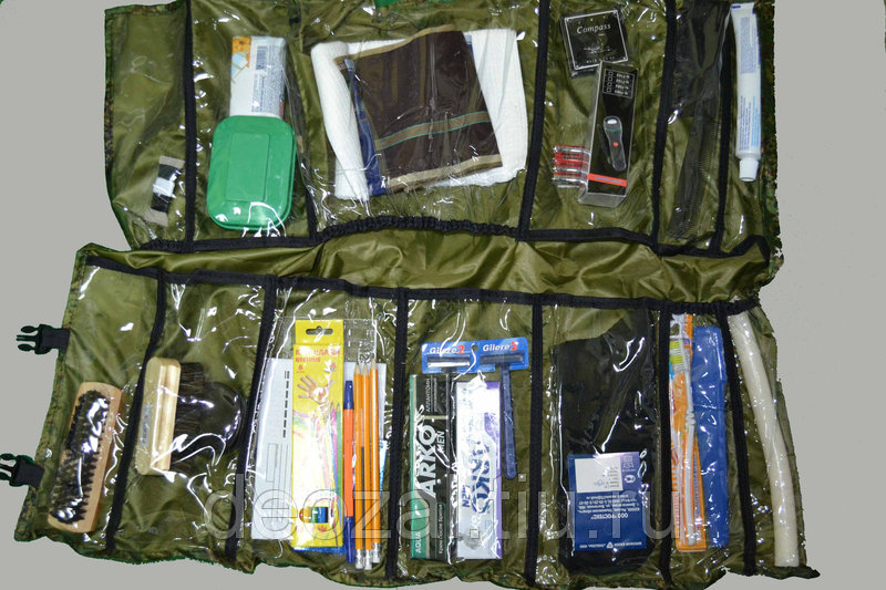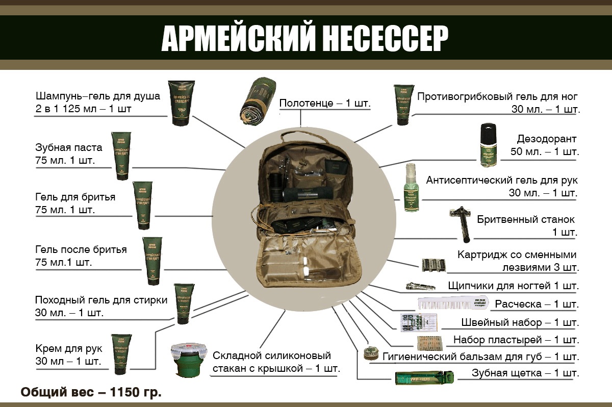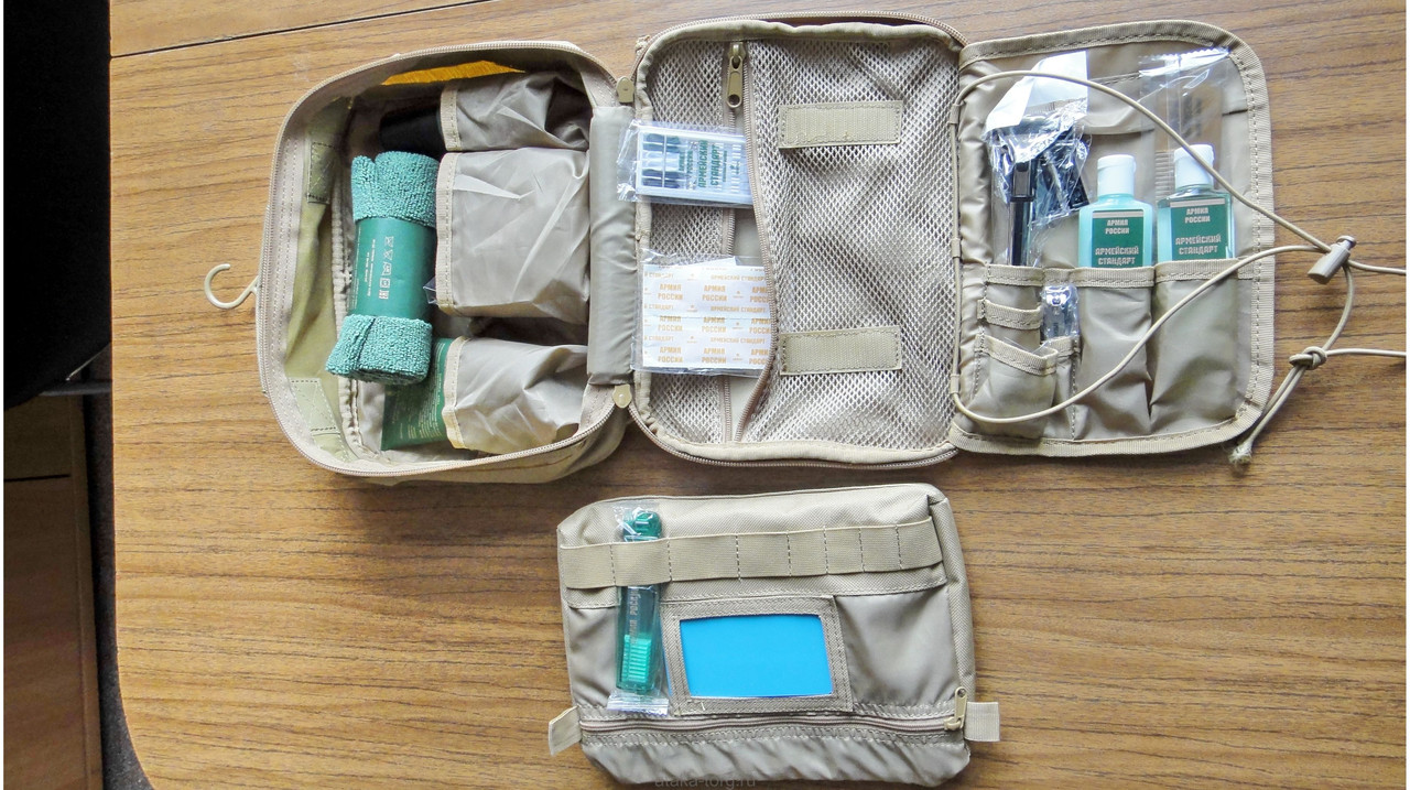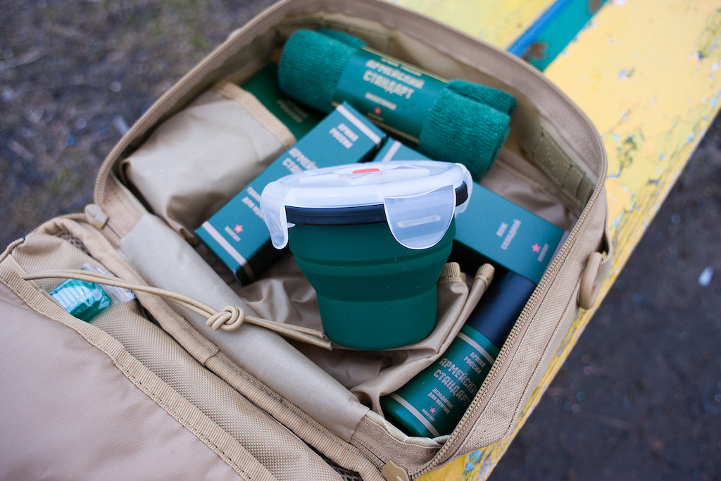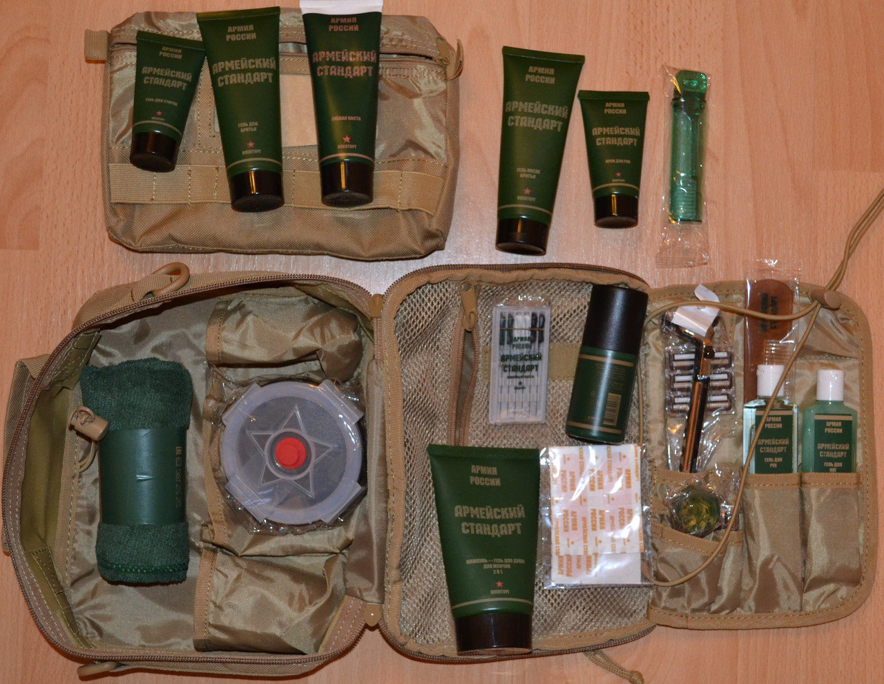 Le sac de voyage militaire est livré en standard avec un baume à lèvres hygiénique, un déodorant à bille de 50 ml pour hommes et un gel de voyage de 30 ml pour le lavage. Un prélèvement réglementaire est impossible sans un coupe-ongles, une serviette en coton vert foncé mesurant 40 par 40 centimètres, un kit de couture, un set de pansements, un peigne en plastique, ainsi qu'un gobelet pliable en silicone équipé d'un couvercle et d'un petit miroir. L'ensemble à repriser se compose d'une paire de boutons, de 6 aiguilles, de deux nuances de fil et d'une épingle de sûreté. Le poids total d'un sac de voyage militaire est de 1,15 kilogramme.