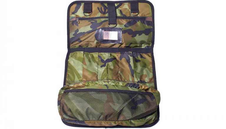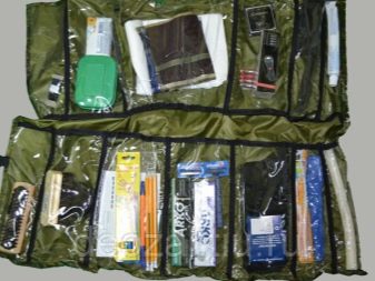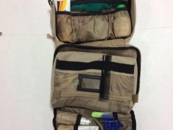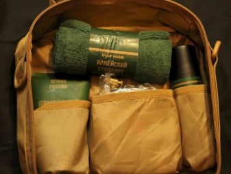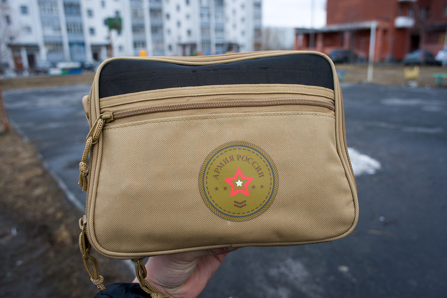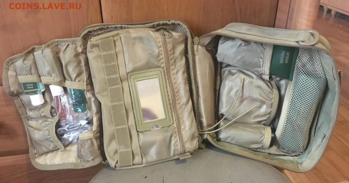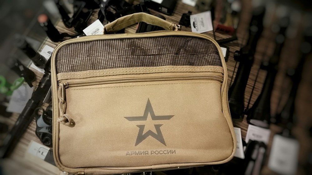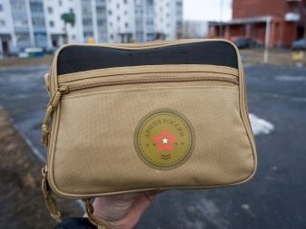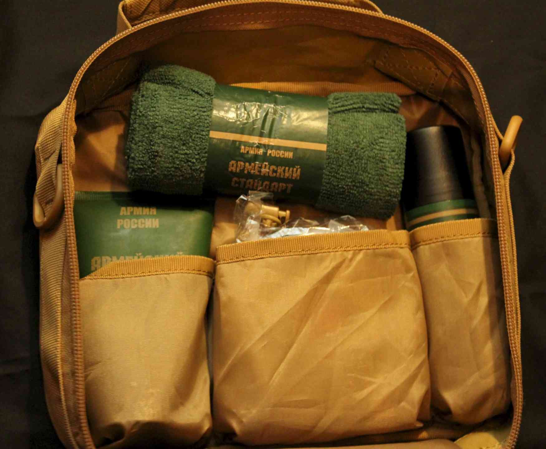 Pour le style intérieur, seuls les articles créés par des fabricants russes sont utilisés, ce qui est également rappelé par l'inscription obligatoire "Armée de Russie". Il convient de mentionner qu'il n'est pas nécessaire d'être militaire pour acheter un sac de voyage - il est disponible à la vente sur le site Web de Voentorg et dans ses magasins. Parfois, cependant, le kit est également disponible à la vente. L'ensemble complet du sac à main est idéalement situé dans des poches individuelles. Au verso de la "trousse à cosmétiques pour hommes", il y a un détail qui vous permet de fixer l'article sur le mur de la porte ou le crochet.