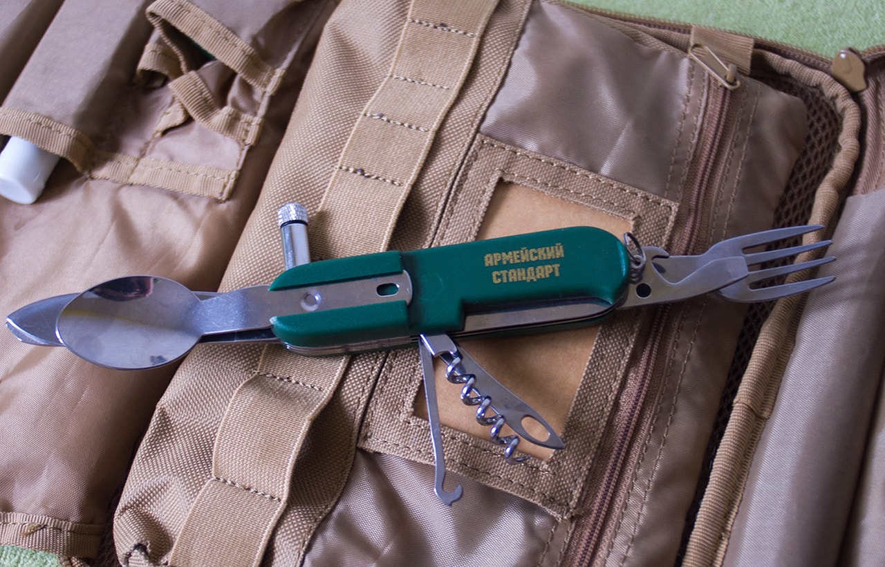 Il convient d'ajouter qu'en plus de recruter un conscrit, il existe également un sac de voyage d'officier. En fait, il ne diffère du kit militaire habituel que par deux ajouts : un couteau pliant avec une lampe de poche et de l'eau de toilette. Le couteau est également équipé d'une fourchette, d'une cuillère, d'un tire-bouchon et de quelques autres outils. Le sac de voyage de l'agent pèse environ 1,4 kilogramme. Le sac de voyage de l'entrepreneur est similaire.