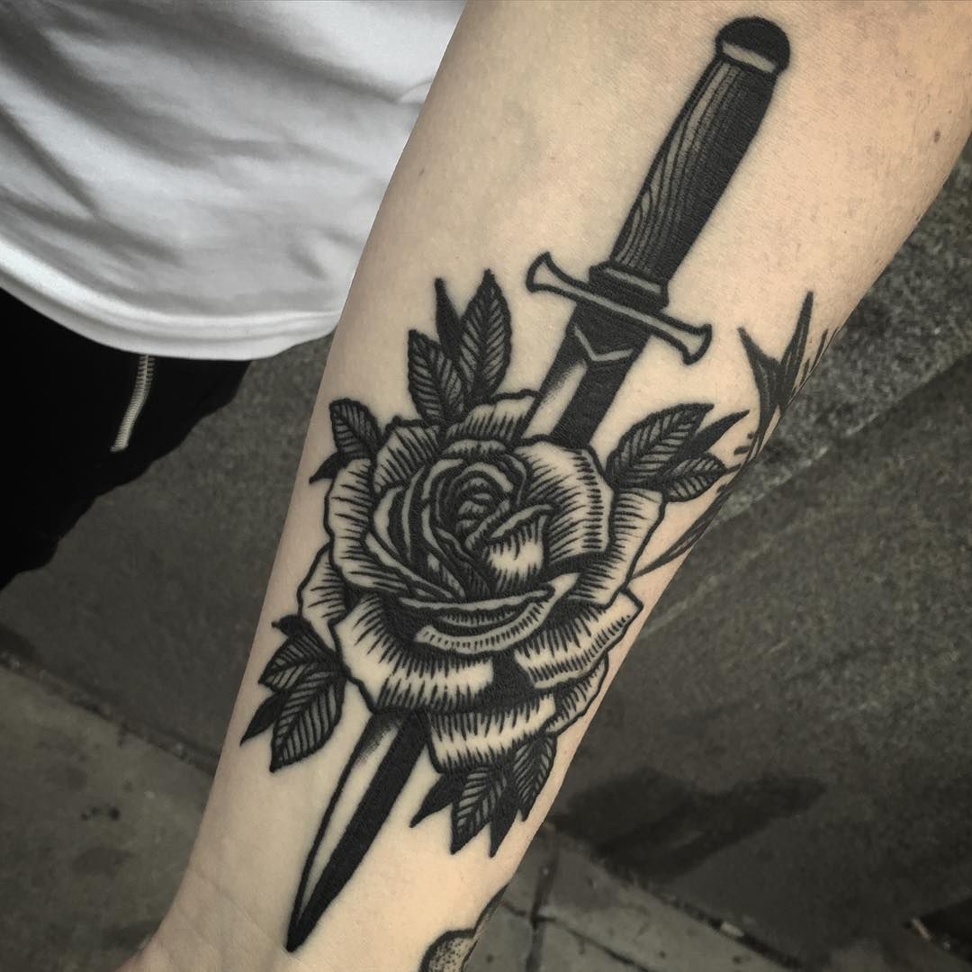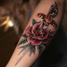 Donc, dague dans un tel tatouage indiquera la passion d'un sentiment romantique et, dans certains cas, il symbolisera également une relation amoureuse contradictoire pour beaucoup.