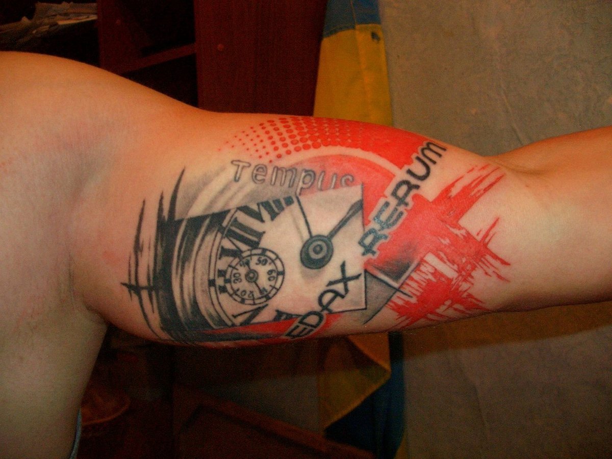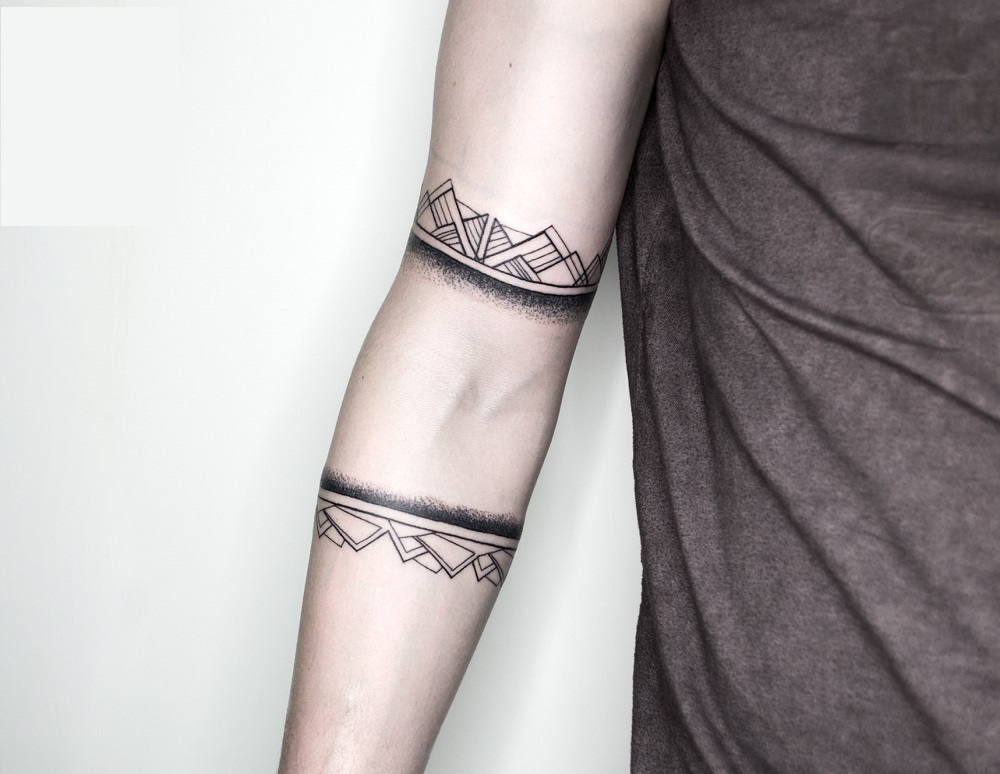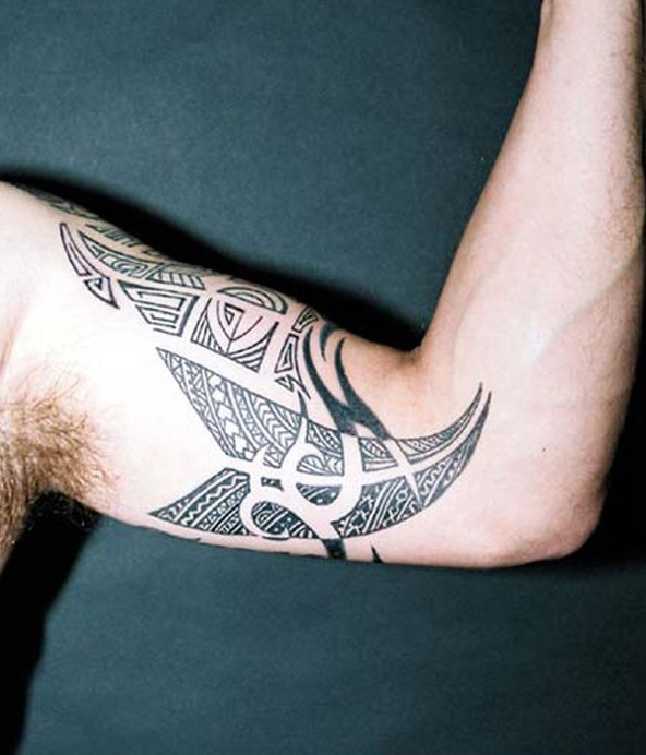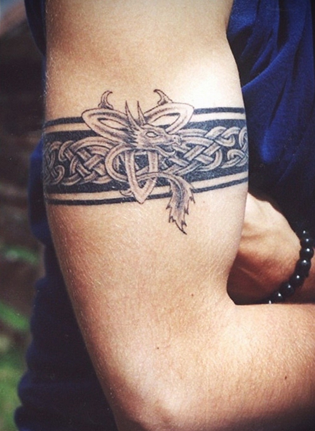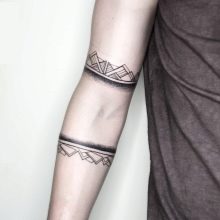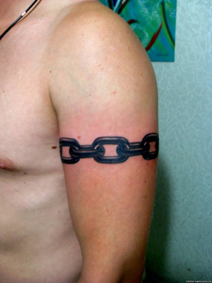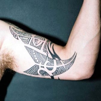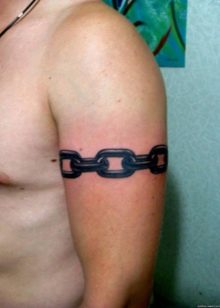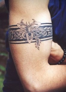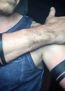 Les tatouages sur les biceps en forme de "bracelets" sont également très courants. De tels dessins aident un homme à augmenter visuellement le volume des muscles, à souligner leur forme. Dans le même temps, le "bracelet" lui-même peut avoir une apparence complètement différente : sous la forme d'épines, de motifs bizarres qui ont une signification supplémentaire, et plus encore. Tout dépend des préférences du propriétaire du futur dessin.