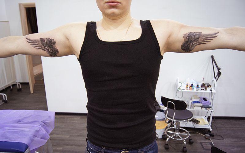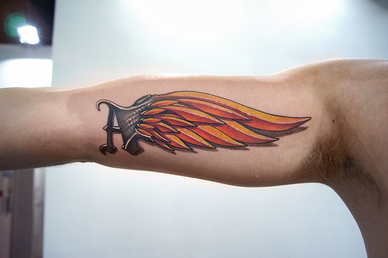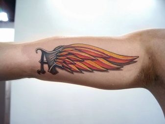 Un tatouage avec des ailes est également assez courant. Sur le biceps, en règle générale, une aile est représentée, généralement celle d'un oiseau ou d'un ange. Le sens d'une telle image est double. D'une part, un tel tatouage peut signifier le désir d'une personne de rêver, de voler, de quelque chose de romantique, d'autre part, l'inaccessibilité, car les ailes sont souvent associées à des êtres supérieurs chez l'homme, à savoir: les anges, les dieux et les dragons.