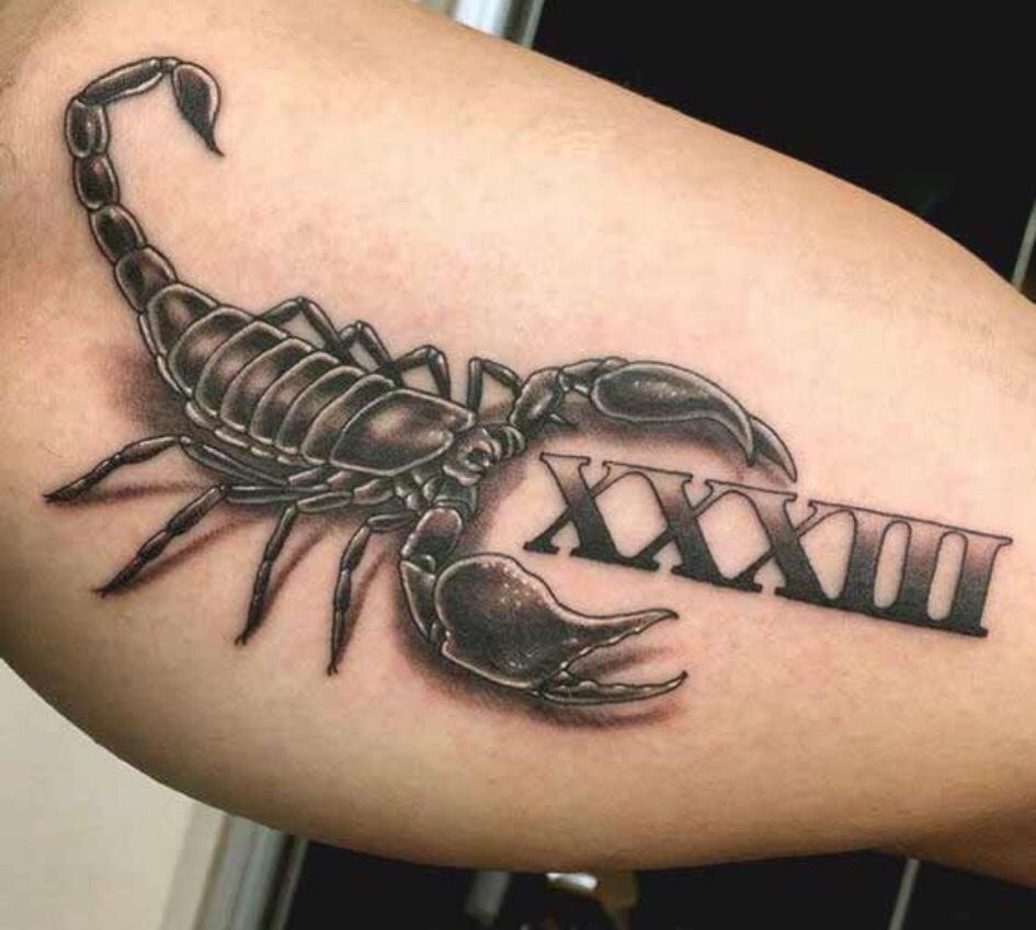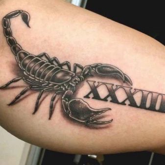 L'image d'un scorpion sur le biceps semble également très intéressante. Dans de nombreuses cultures, cet insecte est traité avec beaucoup de respect. Par exemple, dans la Grèce antique, il était considéré comme un symbole de longévité, de victoire, de détermination et de persévérance. Cependant, il existe une autre interprétation. Ainsi, au Moyen Âge, l'image d'un scorpion chez de nombreux peuples était associée au diable et aux forces du mal.