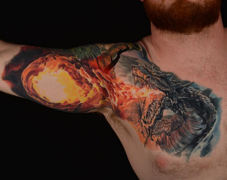Souvent, les hommes préfèrent un style tel que le réalisme, surtout lorsqu'il s'agit de dessins d'animaux ou de portraits humains. De telles images sont généralement à très grande échelle et occupent une grande partie de la peau, car dans les petits dessins, il est presque impossible d'obtenir un degré de détail élevé, ce qui permet d'obtenir un effet naturaliste aussi important.