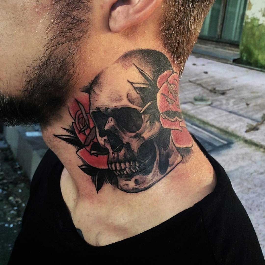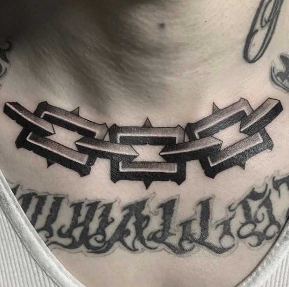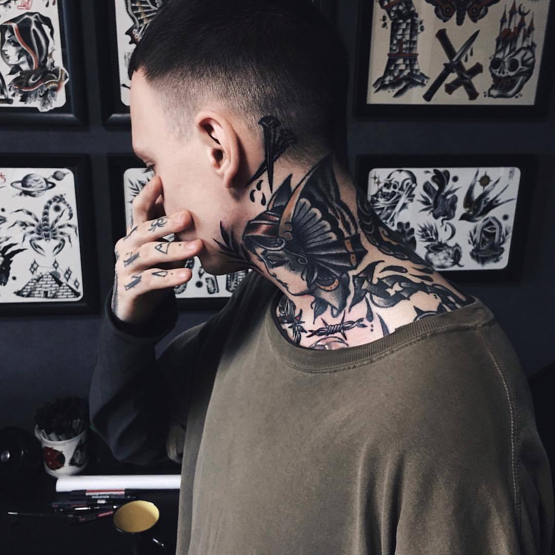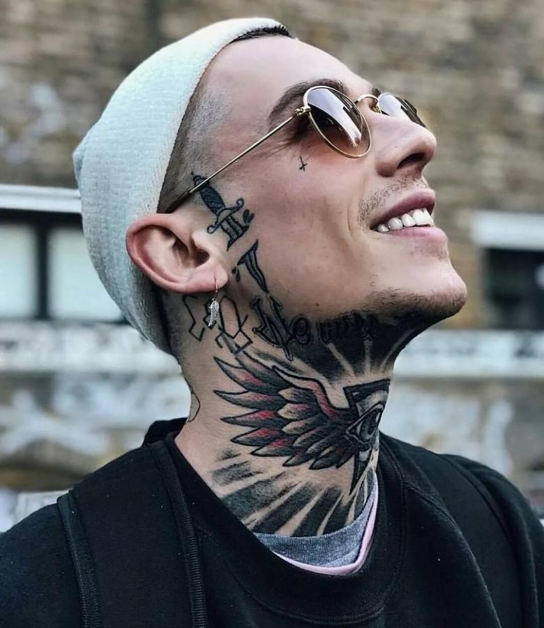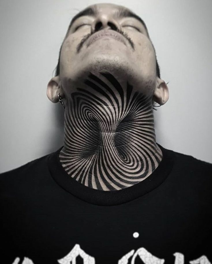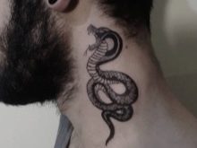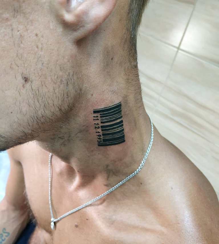 Le tatouage masculin situé au milieu du cou semble intéressant. Fabriqué de manière réaliste, il crée un effet visuel spécial.