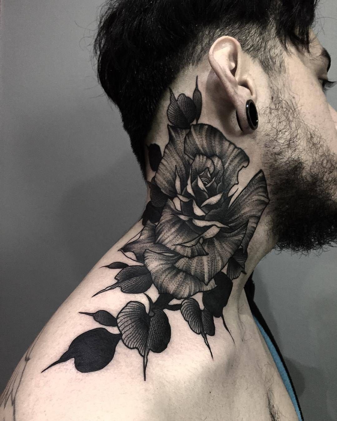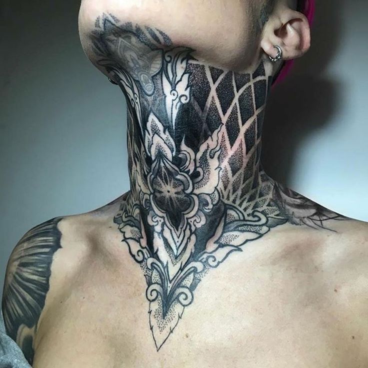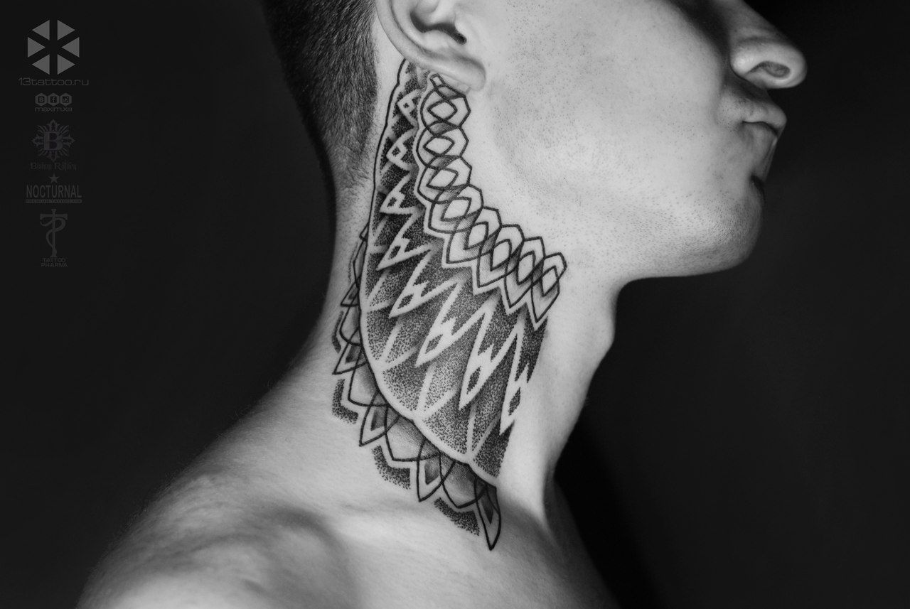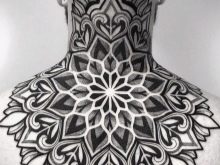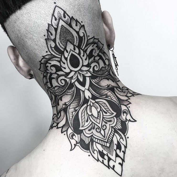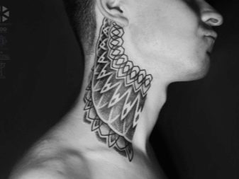 Les tatouages ornementaux au cou rappellent les pages à colorier anti-stress. Ils sont exécutés à l'encre noire. La direction est considérée comme jeune, mais elle est demandée par un large éventail d'hommes.