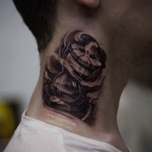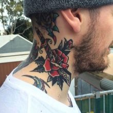 Il y a plusieurs raisons pour se faire tatouer le cou. C'est une façon de s'exprimer, de mettre en évidence, de démontrer votre propre individualité. Les tatouages au cou pour hommes sont le choix des hommes qui rendent hommage à la mode, appartenant à une sous-culture particulière. Plus rarement, il s'agit d'un moyen de masquer les cicatrices, coupures, brûlures existantes.