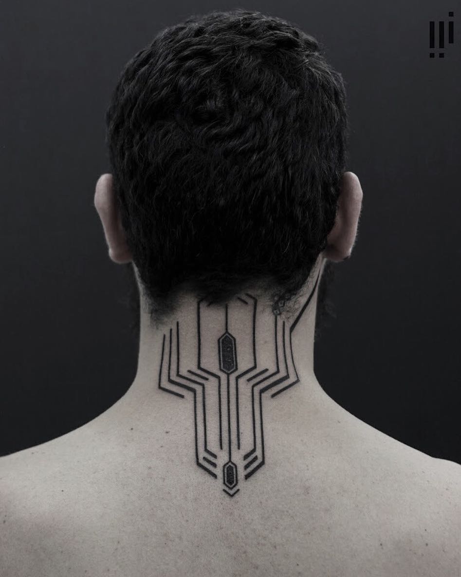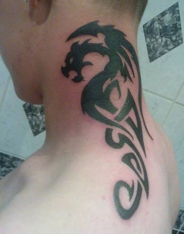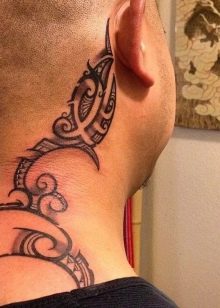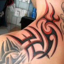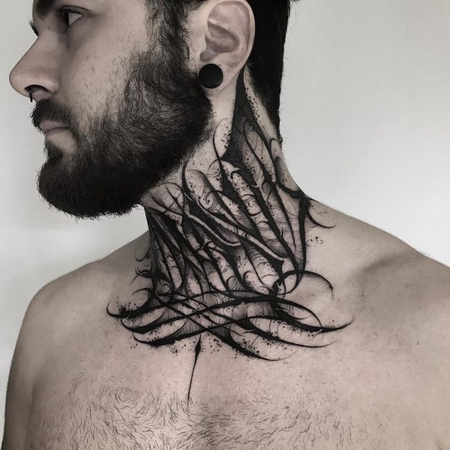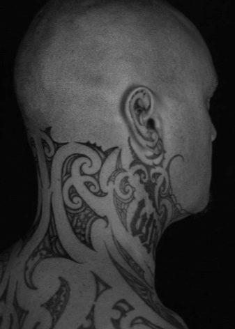Les tatouages tribaux cool sont réalisés à l'aide de la technique du «collier», qui consiste à dessiner des éléments du motif sur tout le cou avec une transition vers la ceinture scapulaire.