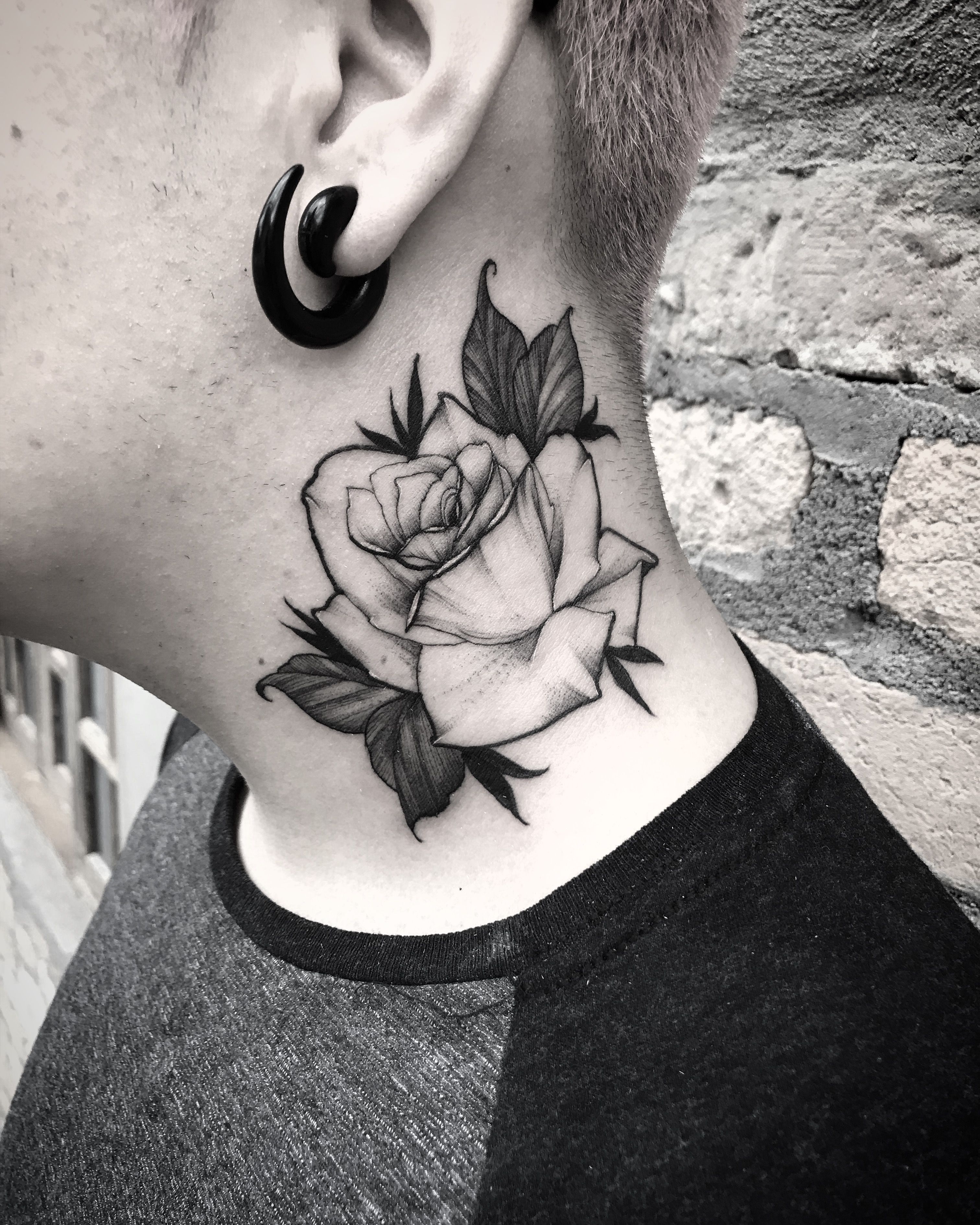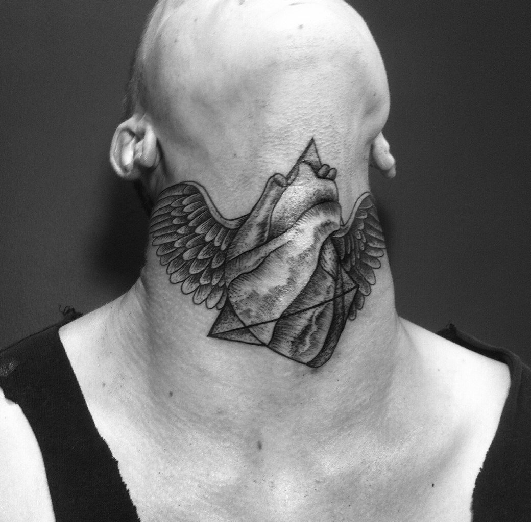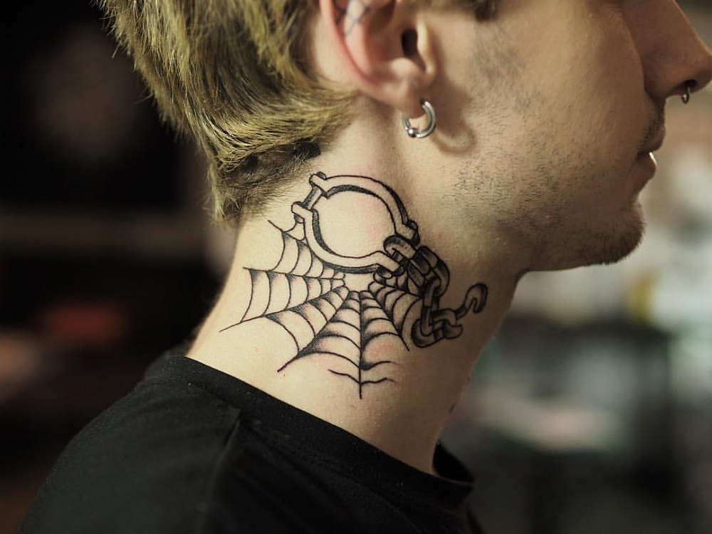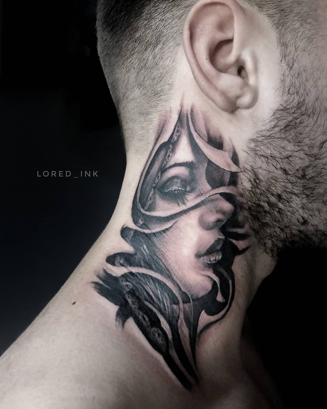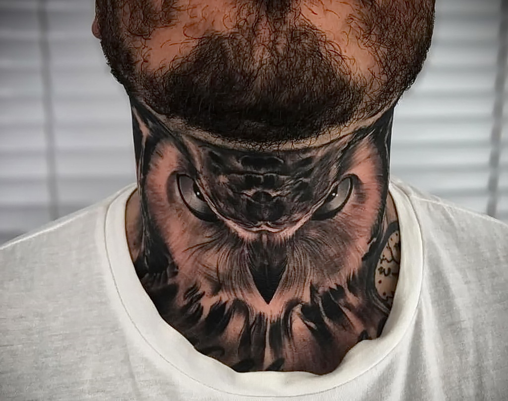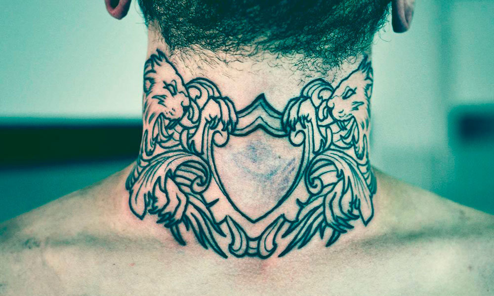 L'image au dos peut être combinée avec un tatouage au dos. Une solution extraordinaire est l'emplacement devant la gorge et la pomme d'Adam.