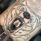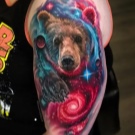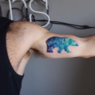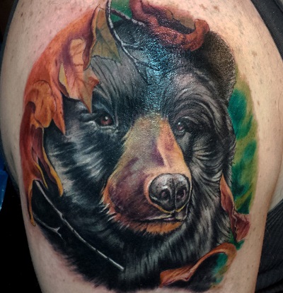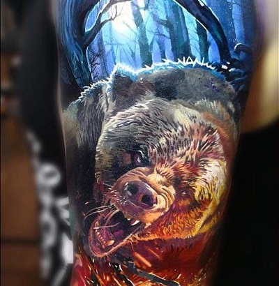 - Le réalisme... Le moyen le plus simple pour tout amateur de tatouage est d'appliquer une image photographiquement précise de l'animal sauvage. Dans ce cas, l'ours ne peut être représenté qu'avec un pigment noir et également complété par des détails colorés. Les yeux, la langue, les griffes se détachent brillamment sur le fond d'une teinte unie.