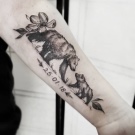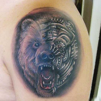 - Biomécanique... Ce style se caractérise par la division de l'image en 2 parties : l'une est réaliste et la seconde ressemble à un animal mécanique avec tous les détails. De tels tatouages sont très difficiles à réaliser, nécessitent une mise en œuvre technique compétente et une étude minutieuse du croquis. L'image peut être monochrome ou en couleur, avoir un ajout sous forme d'armes, d'armures, une image de fond en arrière-plan.